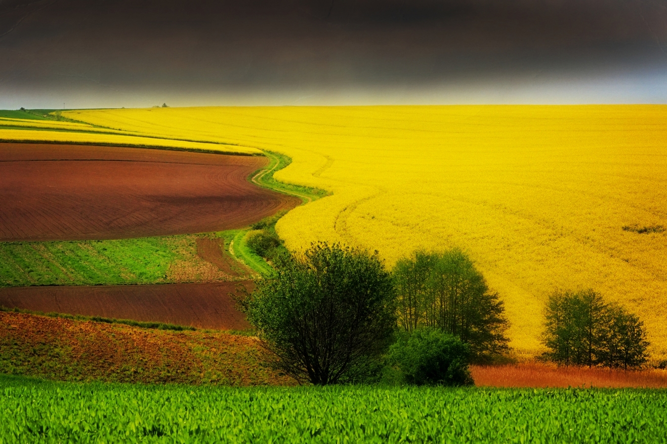Fotografia zrobiona w krainie rzepaku na podkarpaciu tu pasy z krawędziami i zębami pul się przecinają jest to bardzo urokliwe bo co roku występują te kształty gdzie indziej i inaczej uzależnione to jest od terenu pogórza