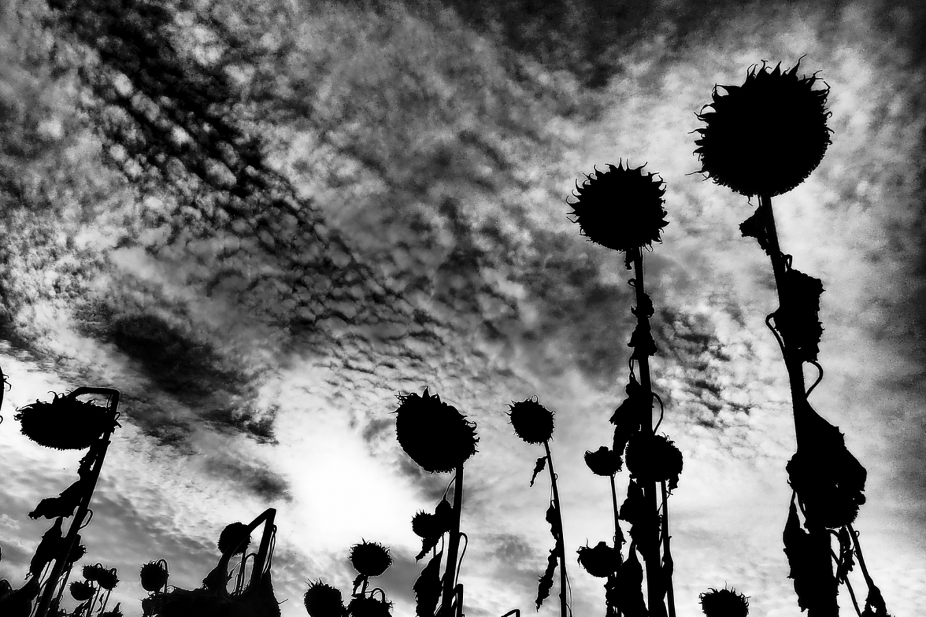 głęboka jesień parę nie zżeranych słoneczników na tle nieba i chmur