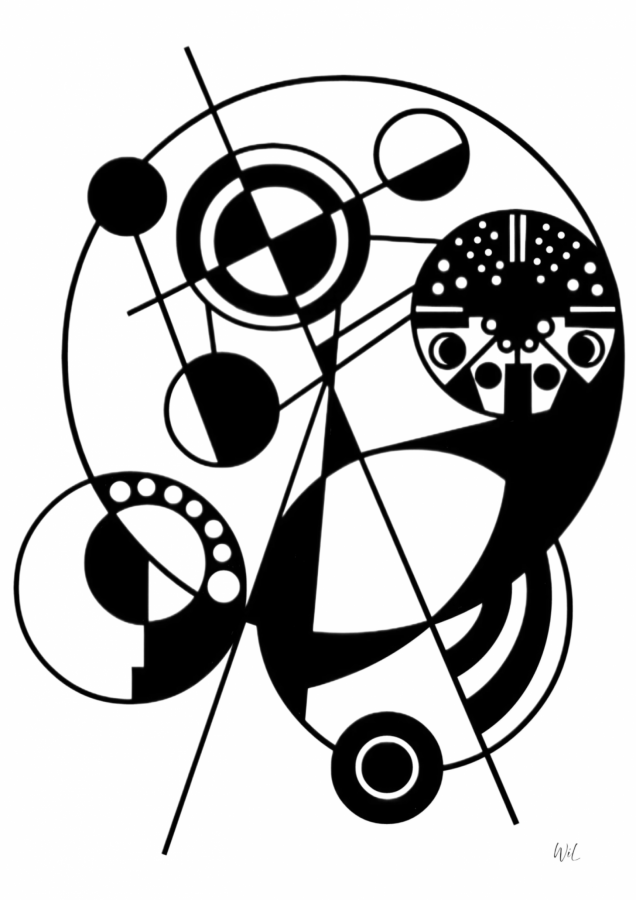 „Koła czasu” – praca z cyklu „Anarchia kosmosu”. Kompozycja oparta na przenikających się okręgach i liniach, które tworzą układ przypominający mechanizm odmierzający rytm zmian. Powtarzające się formy koliste sugerują cykliczność, a przecinające je osie wprowadzają kierunek i napięcie między ruchem a stabilnością. Poszczególne elementy funkcjonują jak punkty w czasie, połączone niewidzialną trajektorią. Czarno-biała struktura podkreśla rytm i zależności, budując wizualną metaforę czasu jako systemu powtarzalnych, lecz zmiennych układów. Technika: grafika cyfrowa (digital painting). Wykonanie: rysunek odręczny na tablecie graficznym. Prace tworzone w całości odręcznie w środowisku cyfrowym, z wykorzystaniem narzędzi symulujących rysunek i malarstwo. Proces oparty na pracy warstwowej, bez użycia fotografii i gotowych tekstur.