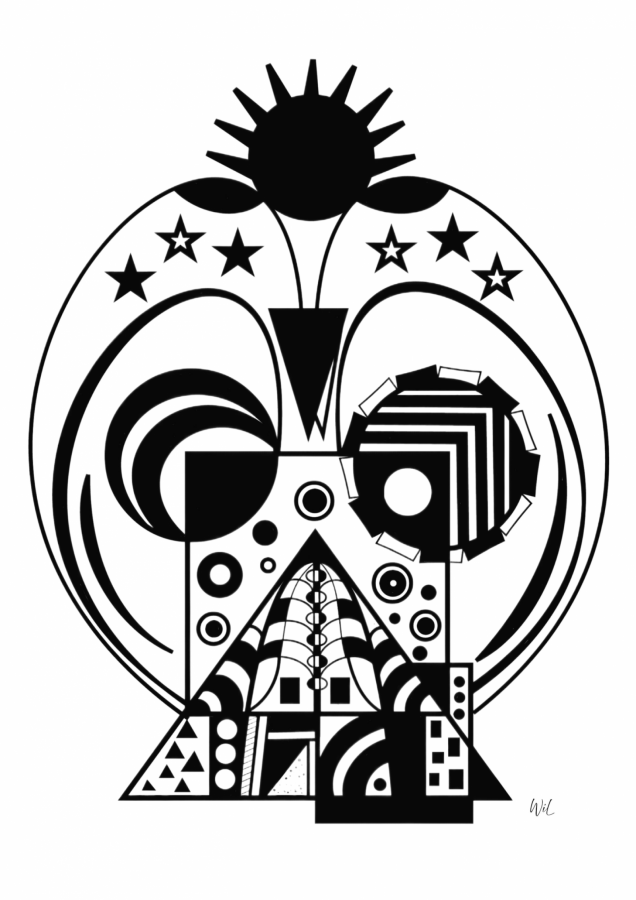 „Miąższ przemijania” – praca z cyklu „Anarchia kosmosu”. Kompozycja zbudowana wokół centralnej, warstwowej struktury, w której nakładające się formy tworzą gęsty układ przypominający przekrój procesu. Okrągła rama i powtarzalne motywy sugerują cykliczność, natomiast zmienne, geometryczne elementy wprowadzają wrażenie ciągłej transformacji. Kontrastowe pola i rytmiczne detale budują napięcie między trwaniem a zanikiem. Czarno-biała kompozycja tworzy wizualną metaforę przemijania jako struktury wielowarstwowej, w której kolejne układy powstają, przekształcają się i zanikają, pozostawiając ślad w całości systemu. Technika: grafika cyfrowa (digital painting). Wykonanie: rysunek odręczny na tablecie graficznym. Prace tworzone w całości odręcznie w środowisku cyfrowym, z wykorzystaniem narzędzi symulujących rysunek i malarstwo. Proces oparty na pracy warstwowej, bez użycia fotografii i gotowych tekstur.
