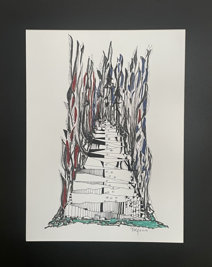 „Schody do ciszy” to grafika o głębokim, introspektywnym charakterze, w której artysta prowadzi widza w głąb tajemniczej przestrzeni. Kompozycja zbudowana z rytmicznych, organicznych linii i pionowych form przypomina ścieżkę lub korytarz między dwoma światami — znanym i nieznanym. Zgeometryzowane schody symbolizują poszukiwanie równowagi i sensu, a ich nieregularny rytm sugeruje, że droga ta nie jest prosta. Odcienie czerni, czerwieni, granatu i zieleni budują emocjonalne napięcie, a jednocześnie nadają całości poetycki, medytacyjny ton. To praca o wewnętrznej podróży, o chwilach, gdy człowiek wspina się ku ciszy — tej, która nie jest pustką, lecz przestrzenią spokoju i skupienia.