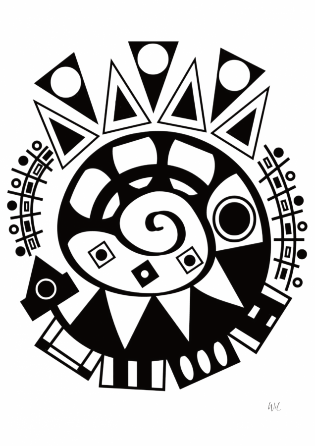 „Spirala zdarzeń” – praca z cyklu „Anarchia kosmosu”. Kompozycja oparta na centralnym, spiralnym motywie, wokół którego układają się rytmiczne formy geometryczne. Okrągła struktura przypomina zamknięty układ, w którym kolejne elementy pojawiają się w powtarzalnym, lecz zmiennym porządku. Promieniste trójkąty i modułowe znaki sugerują etapy narastania i rozchodzenia się zdarzeń. Czarno-biały kontrast podkreśla cykliczność i napięcie między ruchem a stabilnością. Praca tworzy wizualną metaforę procesu, w którym kolejne wydarzenia rozwijają się spiralnie, budując strukturę opartą na powracających, lecz przekształcających się układach. Technika: grafika cyfrowa (digital painting). Wykonanie: rysunek odręczny na tablecie graficznym. Prace tworzone w całości odręcznie w środowisku cyfrowym, z wykorzystaniem narzędzi symulujących rysunek i malarstwo. Proces oparty na pracy warstwowej, bez użycia fotografii i gotowych tekstur.