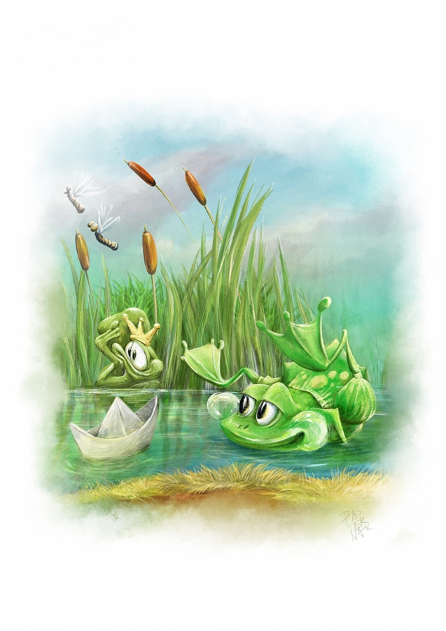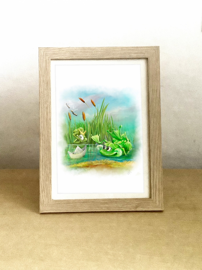 Ilustracja książkowa, przedstawiająca żabki. Ze względu na czyste kolory i stylistykę, praca może służyć do dekoracji pokoju dziecięcego. Oferta dotyczy samego wydruku, bez oprawy. Druk giclee.
