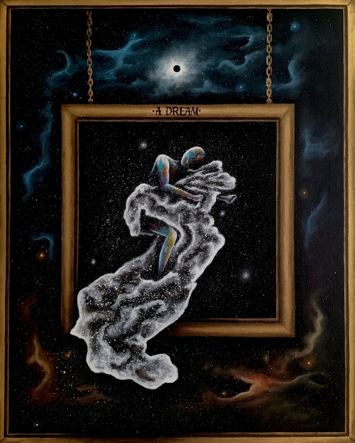 Obraz o uczuciu snu i o śnieniu. Postać z kolorów swoich emocji zawieszona jakby w kosmosie otulona a i trzyma się kurczowo kołdry z gwiazd i mikrokosmosów... Boki zamalowane na czarno.
