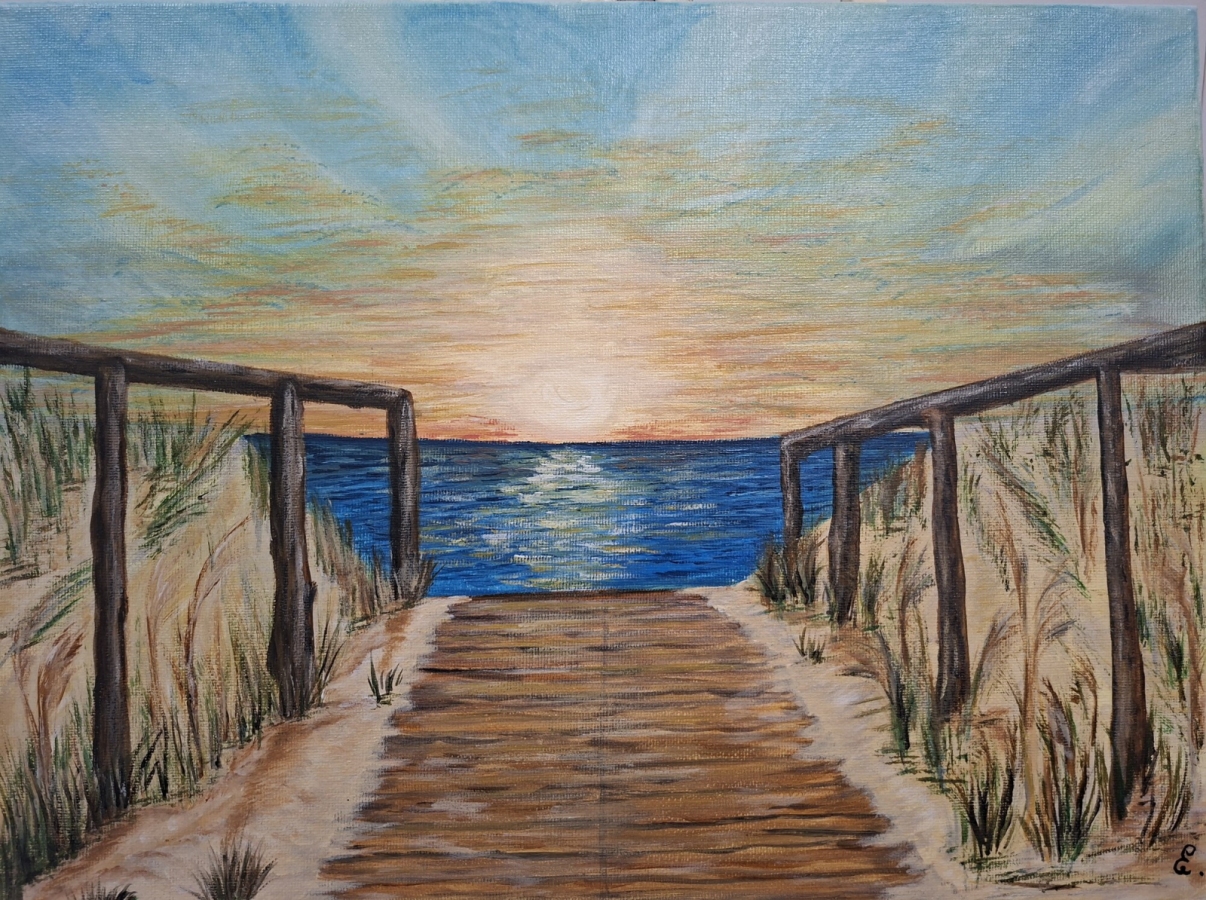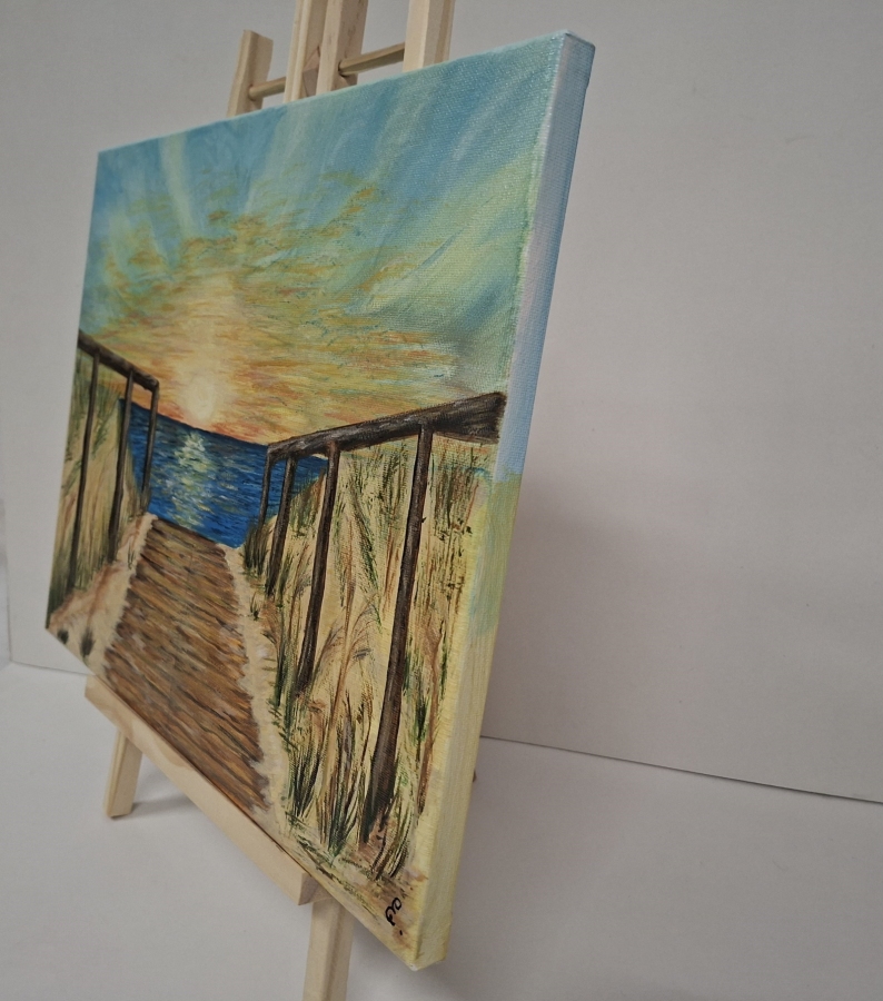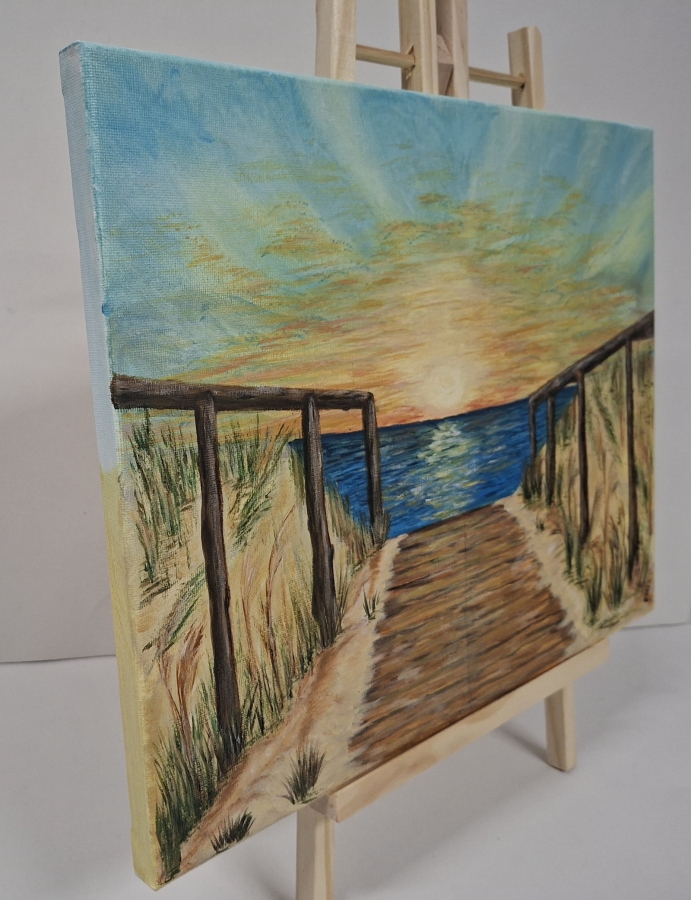 Może nad morze. Myślę, że każdy lubi zachody i wschody na morzem. Zawsze ten widok czaruje kolorami i właśnie ta feria kolorów była motywacją do namalowania tego obrazu. Obraz malowany farbami akrylowymi na kanwie z płótna.