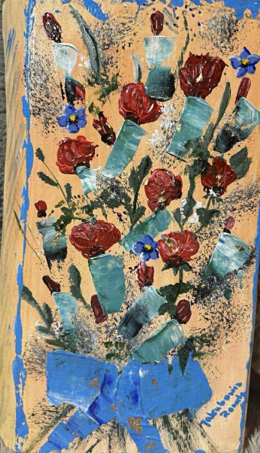 Abstrakcyjny bukiet kwiatów wykonany farbami akrylowymi na litym drewnie wykończony lakierem na bazie żywicy.