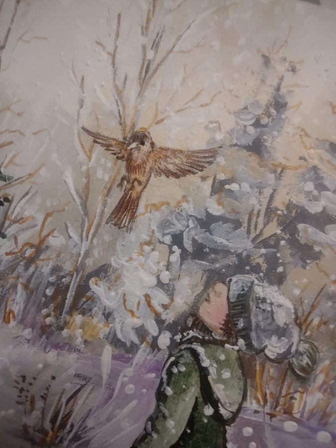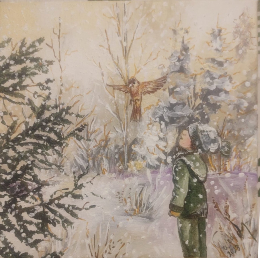 Na obrazie widzimy zimowy pejzaż pełen magii i spokoju. Dominują białe i szare odcienie, ale gdzieniegdzie przebijają się ciepłe brązy, szczególnie w postaci ptaka, który zdaje się lecieć tuż nad dzieckiem. Śnieg obsypuje całą scenę, niby w magiczny sposób spowijając drzewa i postać. Kompozycja jest przemyślana, centralnym punktem staje się malec, który patrzy z fascynacją na ptaka. Atmosfera obrazu jest niemalże bajkowa, pełna niewinności i ulotnego zachwytu dziecka nad światem. Styl artystyczny jest delikatny, z miękkimi, płynnymi pociągnięciami pędzla. Obraz emanuje ciepłem, mimo zimnej scenerii. Widz może poczuć nostalgia, może przypomnieć sobie chwile z dzieciństwa, kiedy każda płatka śniegu była magiczna. Technika użyta przez artystę sprawia, że całość wygląda jakby była częścią większej opowieści. Dzieło wywołuje uśmiech, bo kto nie lubi takich ciepłych momentów? Mieszanka technik sprawia, że obraz jest "enchanting", jak mawiają Anglicy. Czyż to nie piękne, jak sztuka potrafi przenieść nas w inną rzeczywistość? Aż chce się zatrzymać i popatrzeć dłużej.
