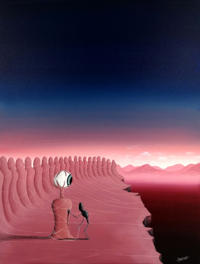 Obraz akrylowy na płótnie bawełnianym, malarstwo surrealistyczne. Praca sygnowana: z przodu - podpis artysty „Asensir”, z tyłu – tytuł / podpis, imię i nazwisko artysty / rok powstania. Praca nie zawiera ramy, boczne krawędzie płótna zamalowane estetycznie na czarno - obraz gotowy do powieszenia. Wymiary: 80x60x2cm. Cykl „AP” (pierwotnie „Alternative painting”) to pierwszy rozdział w twórczości artysty - moment, w którym intuicja, emocje i czysta satysfakcja z tworzenia wzięły górę nad szukaniem gotowych form czy zasad. To w pracach z tego cyklu kształtowała się jego stylistyka, a zarazem fundament, na którym opierają się wszystkie kolejne światy tworzone na płótnie. “AP” to miejsce szukania własnego języka, wypierania się sztywnych reguł i podążania za tym, co podpowiadają emocje. Malarstwo, w którym proces tworzenia jest tak samo ważny jak efekt - szczerą, intuicyjną wyprawą w głąb wyobraźni. To zarazem zapis drogi, jaką artysta pokonał - od pierwszych, intuicyjnych prób w surrealizmie, po świadomość tego, jak mocny potrafi być język sztuki w wyrażaniu doświadczeń.