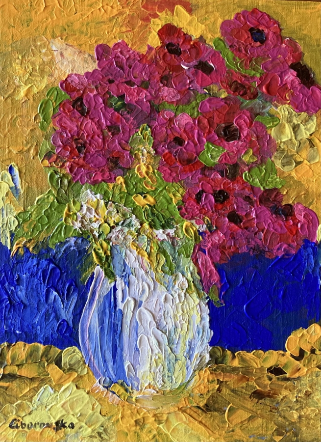 Malinowe kwiaty rozkwitają na tle kobaltu i lekkiego złota. Faktura obrazu jest trójwymiarowa i zmienia się w zależności od kąta patrzenia i światła. Grubo nakładana farba tworzy niemal rzeźbiarską powierzchnię. Kwiaty zostały uchwycone w momencie pełnego rozkwitu. W tym obrazie realizm ustępuje miejsca ekspresji. Obraz został namalowany techniką akrylową na płótnie bawełnianym przyklejonym na płytę.