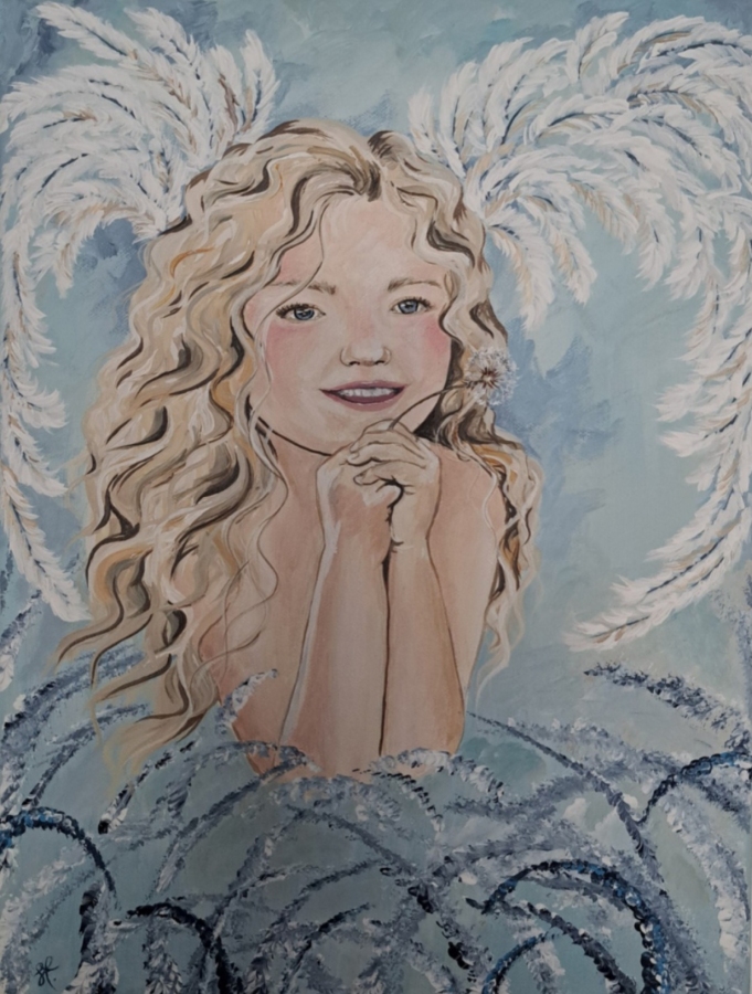 Subtelny, współczesny portret o baśniowym charakterze, utrzymany w delikatnej pastelowej palecie. Przedstawiona postać emanuje spokojem i niewinnością, a motyw skrzydeł nadaje kompozycji symboliczny wymiar wolności i dziecięcej wyobraźni. Miękka linia i wyciszona kolorystyka tworzą harmonijną, poetycką całość, zapraszającą do osobistej interpretacji.
