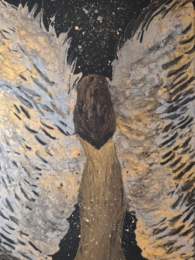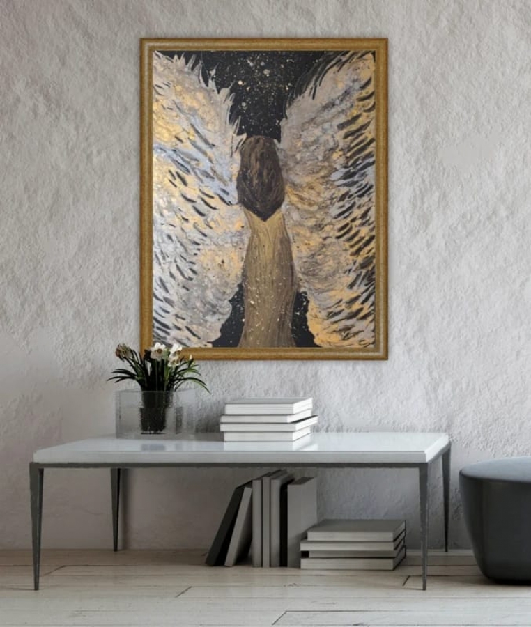 Anioł – oryginalny obraz akrylowy o wymiarze 60x80 cm Symbol spokoju, ochrony i wewnętrznej harmonii. Stonowana paleta beżów i szarości, złota, delikatna faktura i subtelne detale sprawiają, że obraz pięknie pracuje ze światłem i pasuje do nowoczesnych oraz klasycznych wnętrz. ▫️ akryl na płótnie ▫️ oryginał, 1/1 ▫️ sygnowany ▫️ bez ramy ▫️ gotowy do zawieszenia