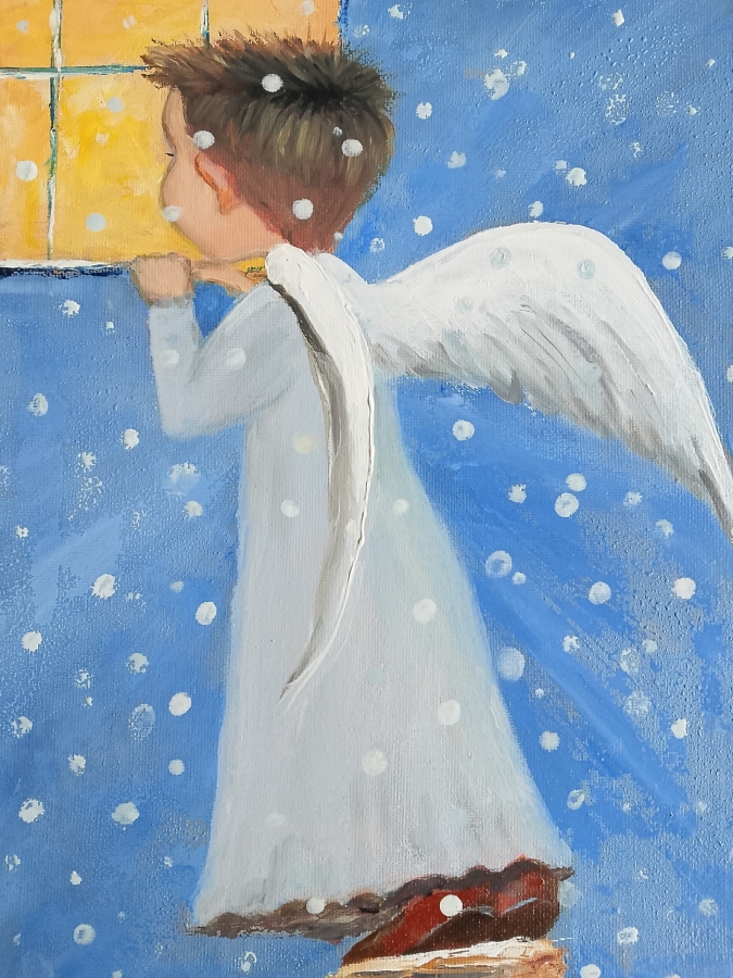 Aniołek Chłopczyk - ręcznie malowany obraz olejny. Płótno na blejtramie. Obraz nie wymaga oprawy - posiada boki zamalowane w formie kontynuacji, co sprawia wrażenie jego przestrzenności. Wymiary 24 cm x 30 cm. Sygnowany. Na życzenie do obrazu dołączony Certyfikat autentyczności.