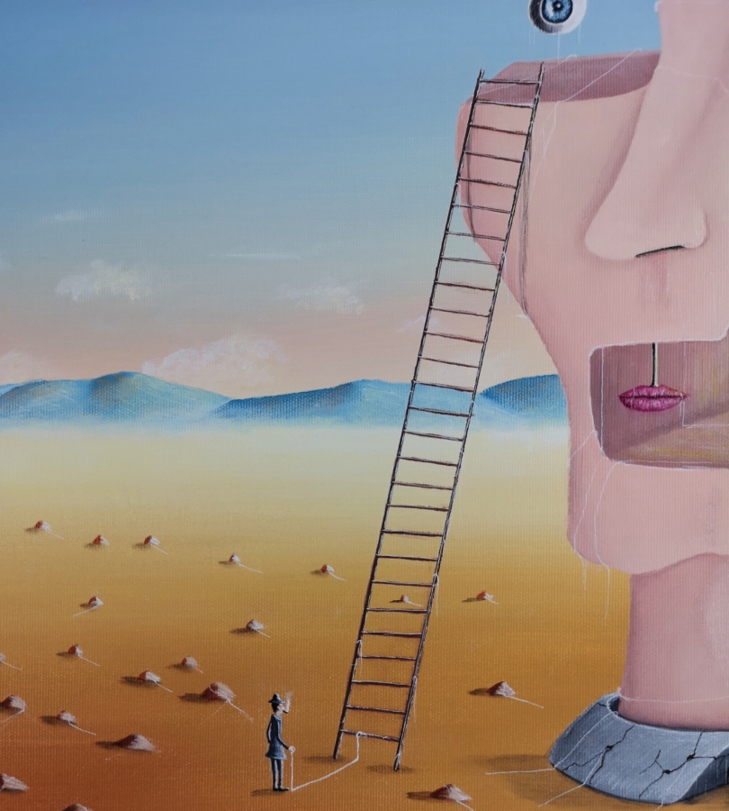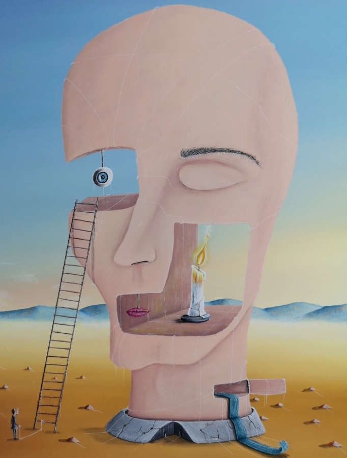obrazakrylsurrealizmfantastykapejzażpustyniagłówapostaćnadrealizmrealizm magicznypostać fantastycznaPejzaż fantastycznyMalarstwoSztuka Współczesna