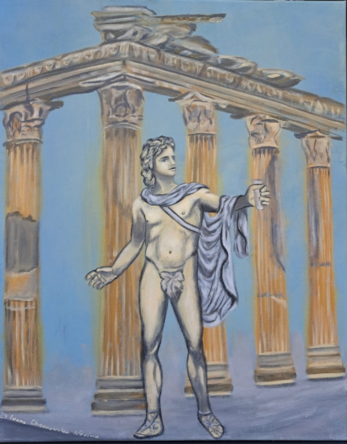 Ruiny świątyni Apolla w Side, w Turcji są prawdziwe, postać dodałam dla zrozumienia, czyja to świątynia. Obraz ma boki zamalowane, zamontowaną zawieszkę.