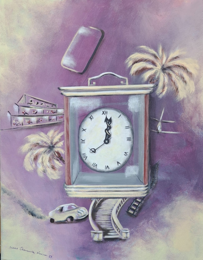 Obraz namalowany farbami akrylowymi na płótnie w pionie. Splątane wskazówki zegara na tle elementów symbolizujących przyjemności, przypomina, że czas to pojęcie względne. Zycie toczy się tu i teraz. Kremowo wrzosowa kolorystyka świetnie sprawdzi się w każdym pomieszczeniu. Boki są zamalowane, zamontowana zawieszka.