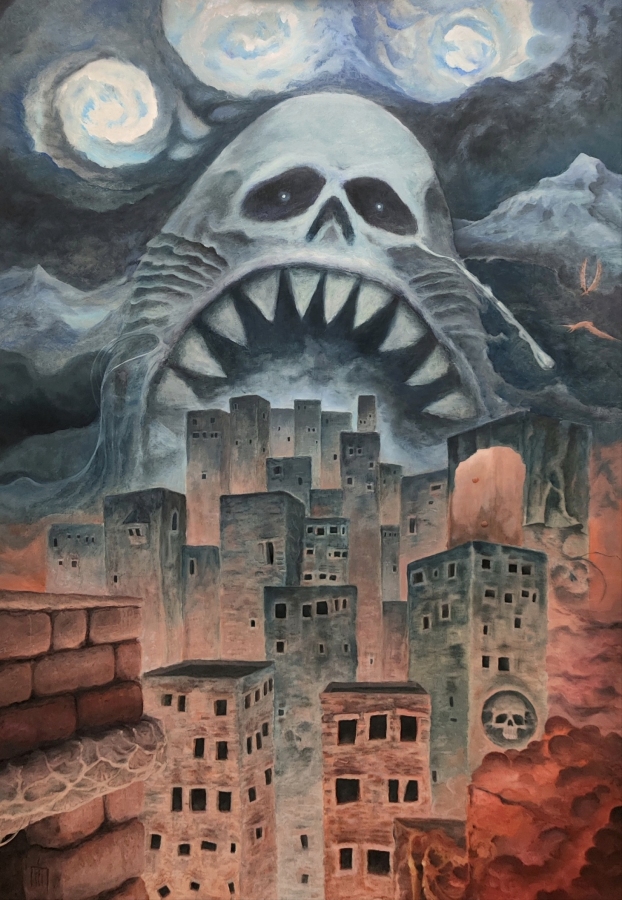 Numer 29, bez tytułu, olej na płycie 70x100cm. Inspiracje - własna głowa. Obraz nie planowany, reakcja na pojawiający się, improwizowany, abstrakcyjny szkic. Pierwsze pociągnięcia liniowe w pionie nadały kierunek, później samo poszło. Miasto jako cywilizacyjna metafora szczytu rozwoju i świetności umiera śmiercią naturalną, cykl dobiega końca, mimo że płonie to zdecydowanie pora zimowa. Gdzie jesteśmy teraz? Nie wiem. To tak w dużym skrócie. Jedyne co mogę zasugerować to chwilę się zatrzymać i popatrzeć.