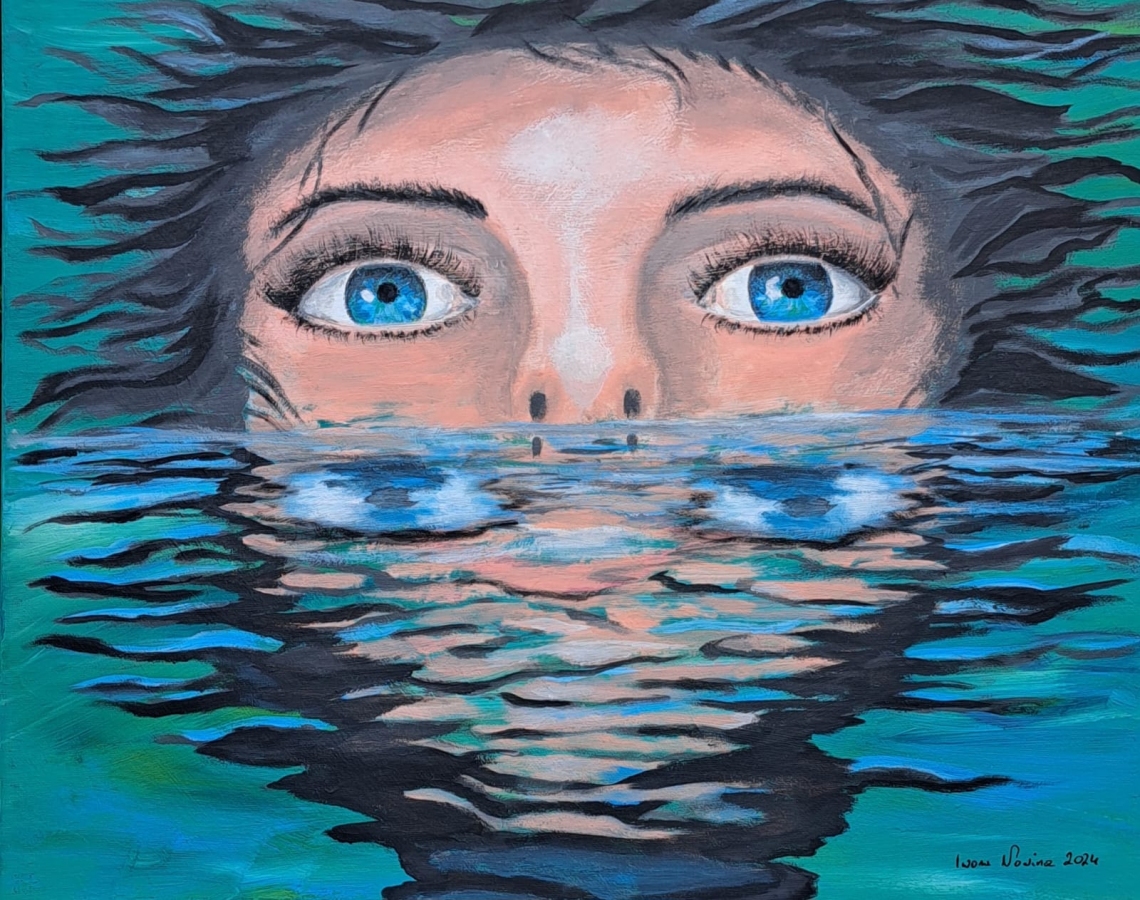 Obraz namalowany farbami akrylowymi Renesans i Amsterdam na płótnie w poziomie. Oczy zanurzonej w wodzie kobiety wyrażają nadzieję i moc. Obraz spełnia rolę nie tylko dekoracyjną, ale dodaje otuchy i dlatego nadaje się do zaistnienia w sypialni, by spojrzeć na niego zaraz po przebudzeniu. Boki są zamalowane, zawieszka zamontowana.