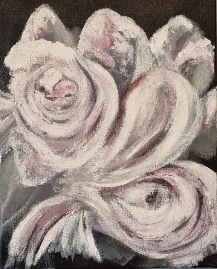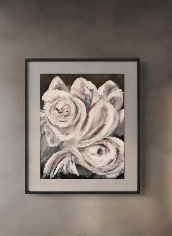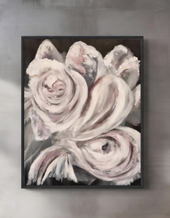 Obraz przedstawia kwit w delikatnych, pastelowych odcieniach – głównie bladego różu, kremowej bieli i subtelnych szarości, z lekkimi akcentami fioletu i beżu. Kwiat jest ukazany z bliska, w sposób niemal abstrakcyjny, z wyraźnymi, grubymi pociągnięciami pędzla i widoczną fakturą farby, co nadaje im objętość i miękkość płatków. Kwiat jest w pełni rozkwitu, z warstwowymi, spiralnie zwiniętymi płatkami, które tworzą dynamiczne, falujące formy. Tło jest ciemne – głęboka czerń – dzięki czemu jasne kwiaty mocno kontrastują i wydają się niemal świecić na jego tle. Kompozycja jest gęsta, kwiaty wypełniają prawie całą powierzchnię obrazu, tworząc wrażenie obfitości i zmysłowości. Całość ma romantyczny, nieco melancholijny i marzycielski nastrój, wzmocniony miękką, impresyjną techniką malarską i stonowaną, elegancką paletą barw. Ramka obrazu zamalowana jest głęboką czernią tła obrazu. Zabezpieczony matowym werniksem. Oprawione prace są jedynie przykładową wizualizacją.