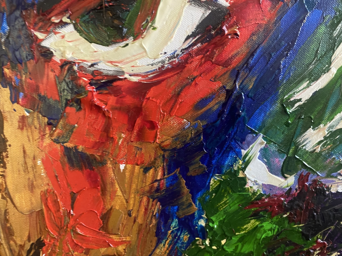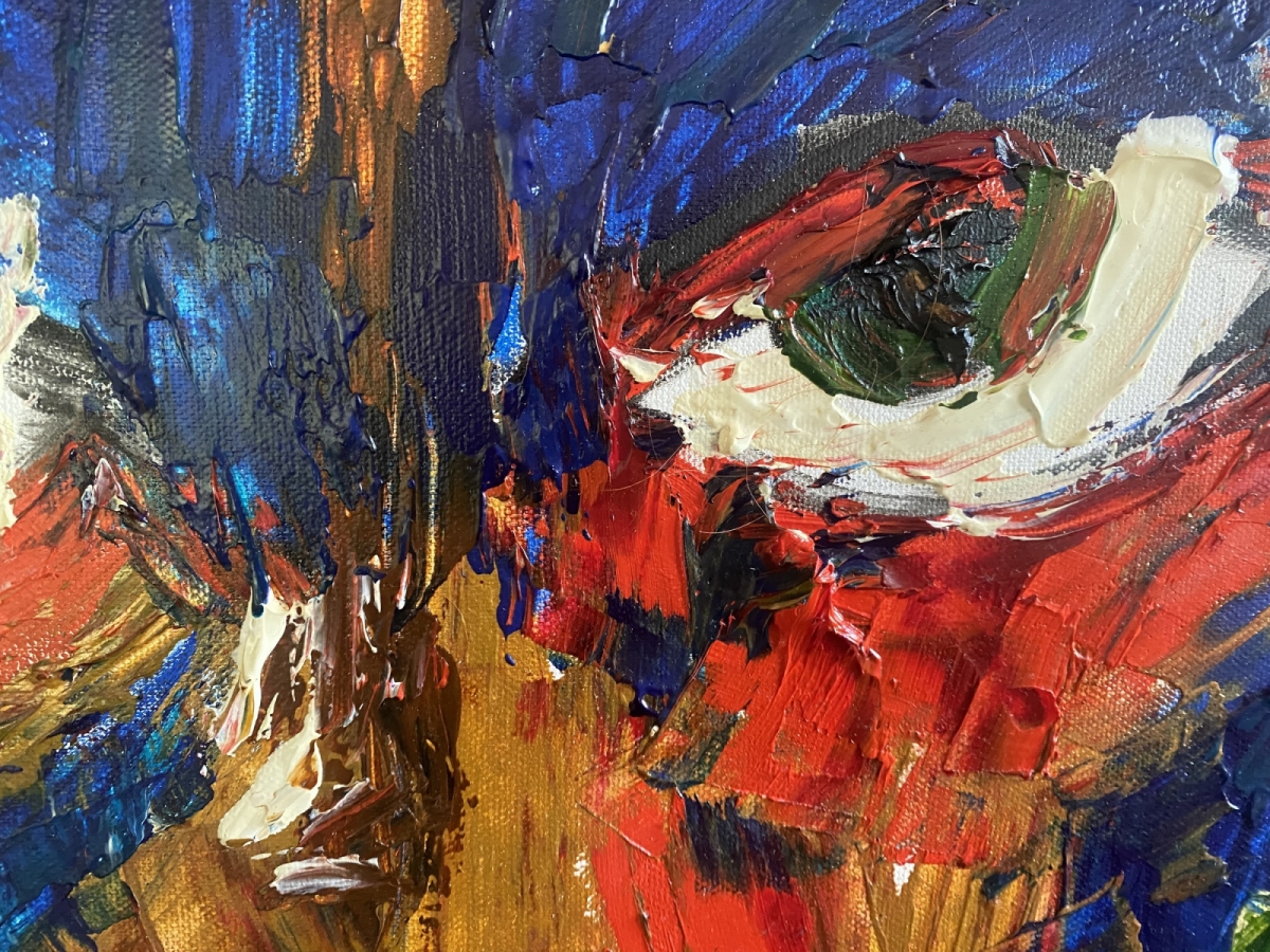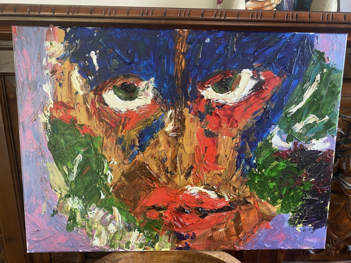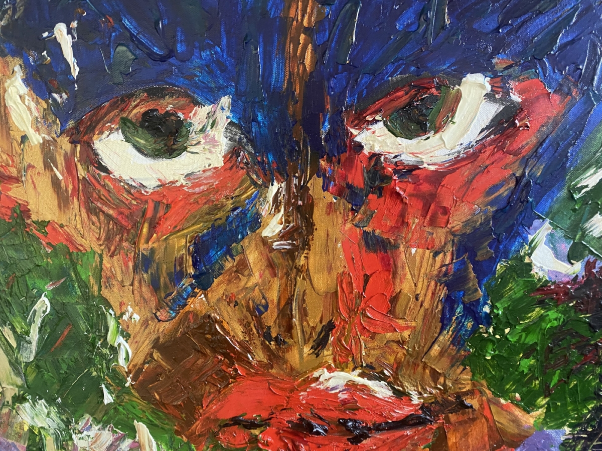 Twarz z bliska, spojrzenie, które zatrzymuje. Kobalty, zielenie i czerwienie przecinają się w grubych warstwach farby, nadając emocjom konkretny kształt. Obraz jest szczery, ekspresyjny, magnetyczny — idealny jako centralny punkt pokoju, który ma mówić własnym głosem.