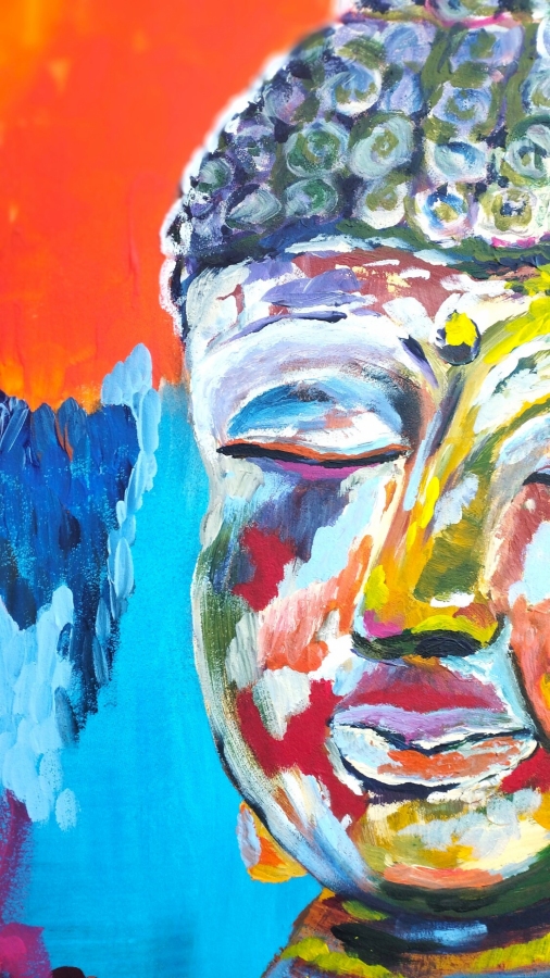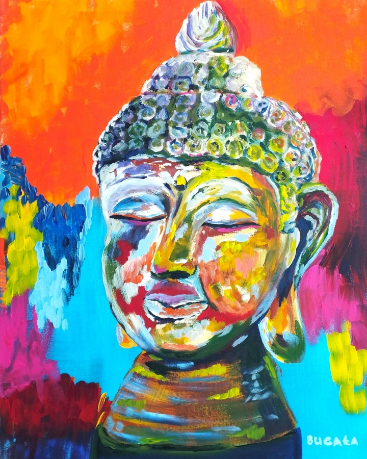 Współczesne ujęcie motywu Buddy przedstawione w spokojnej, frontalnej pozie z zamkniętymi oczami. Kompozycja opiera się na silnym kontraście między wyciszoną, harmonijną twarzą a intensywnym, wielobarwnym tłem. Zestawienie nasyconych czerwieni, oranżów, błękitów i żółci tworzy aurę energii, która podkreśla duchowy charakter przedstawienia. Styl łączy figuratywność z elementami ekspresyjnej abstrakcji, nadając dziełu nowoczesny, dekoracyjny i emocjonalny wymiar. Obraz świetnie odnajdzie się w nowoczesnych wnętrzach, przestrzeniach medytacyjnych oraz kolekcjach sztuki współczesnej o tematyce duchowej i refleksyjnej.