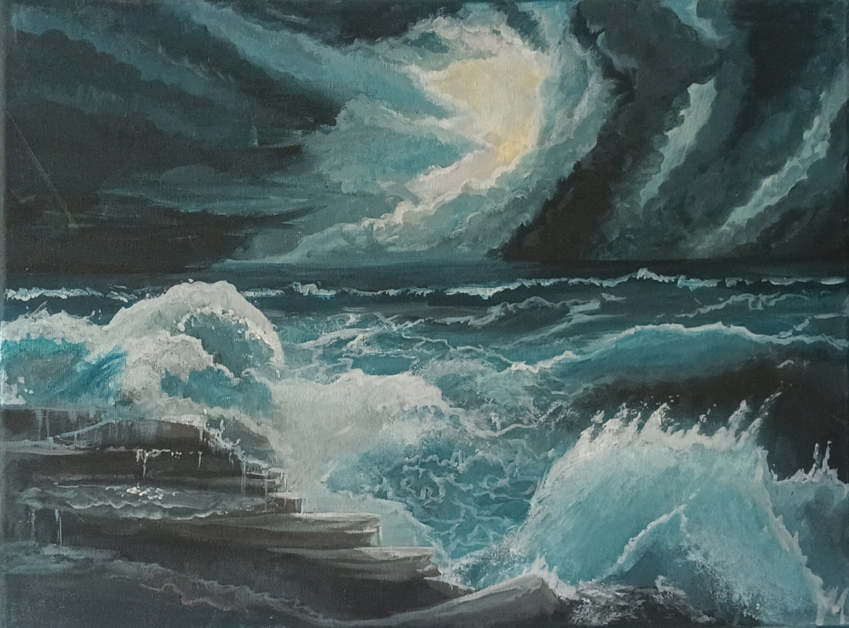 Czasem nawet podczas burzy na morzu w tle widać prześwitujące słońce - nadzieję, że kiedyś będzie łatwiej. Obraz powstał z tęsknoty za morzem i chęci pokazania go w nieco inny sposób niż zwykle na większości zdjęć - spokojnej tafli z zachodzącym w tle słońcem. Tutaj morze jest niebezpieczne, nieco dzikie, nieprzeniknione. W tle jednak, wśród kłębiących się chmur, widać prześwit słońca, który sugeruje, że ta sytuacja nie będzie trwać wiecznie. Akryl na płótnie, podbitym drewnianą ramą. Boki pomalowane są na ciemnoturkusowy kolor, współgrający z kolorystyką obrazu.