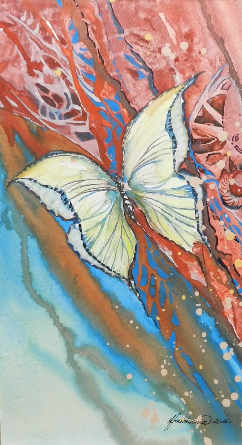 Akwarela malowana na artystycznym papierze akwarelowym o wymiarze 20x36 cm. Obraz przedstawia motyla unoszącego się w przestrzeni koloru i faktury . Sygnatury autorskie umieszczone z przodu i tyłu pracy. Praca zabezpieczona jest werniksem. Oryginalna praca , potwierdzona Autorskim certyfikatem Autentyczności wystawionym i podpisanym przez Artystkę . __________ Art by Jolanta Frankiewicz _________