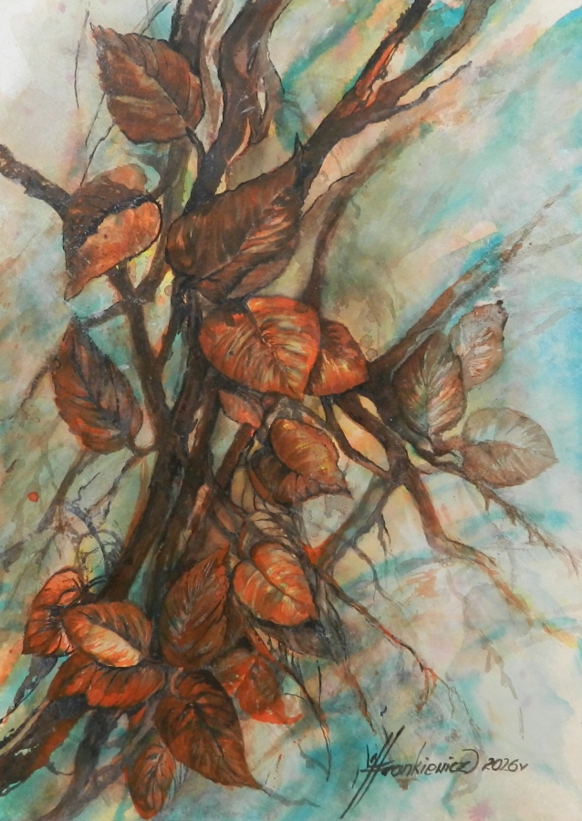 Obraz malowany tuszem na papierze artystycznym . Do tworzenia Artystka wykorzystała tusze w trzech kolorach : brązowy, niebieski i pomarańczowy . Wybrane barwy , oraz ich odcienie podkreślają formę i nastrój obrazu . Format pracy 29,7x42 cm. /A3/ Oryginalna praca , jedyny egzemplarz opatrzony Autorskim Certyfikatem Autentyczności. Praca zabezpieczona werniksem. Sygnatury autorskie umieszczone z przodu i z tyłu pracy. ------------Art by Jolanta Frankiewicz-----------