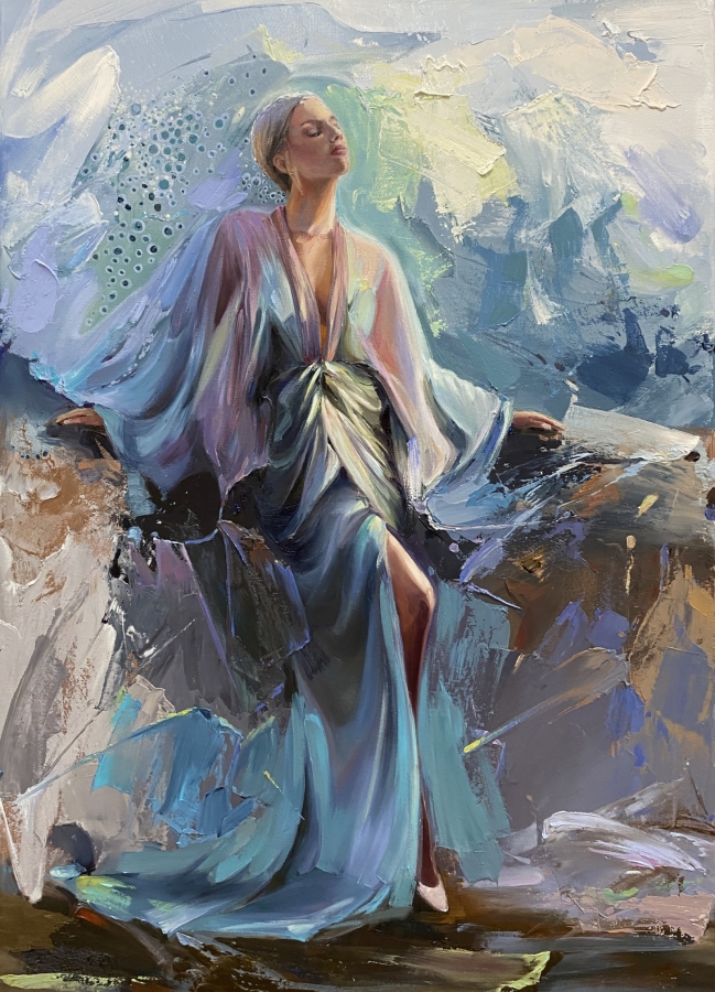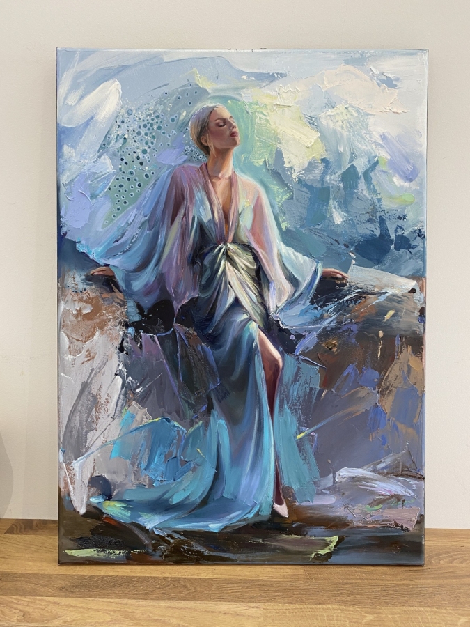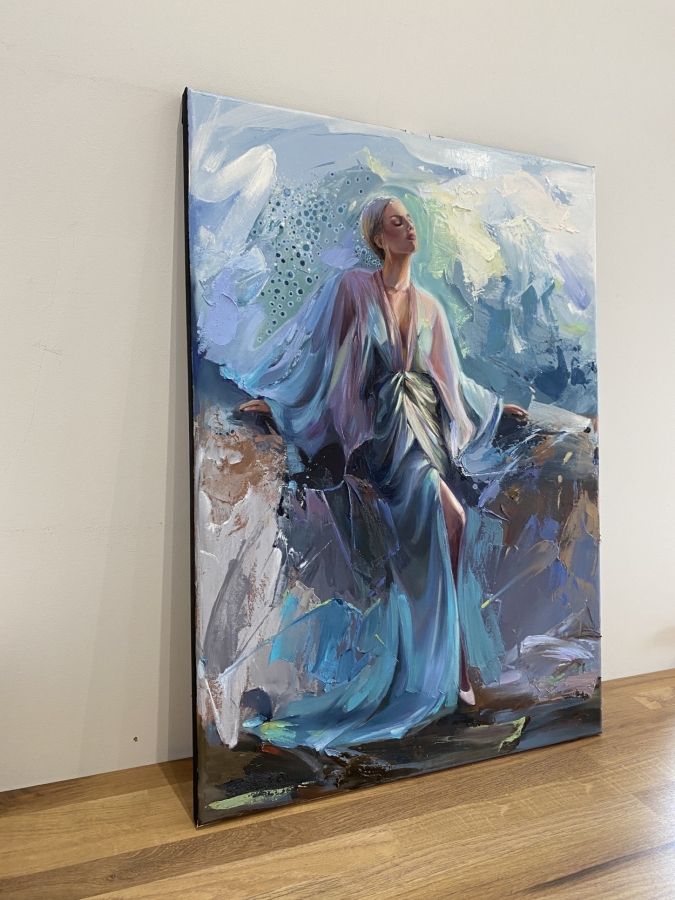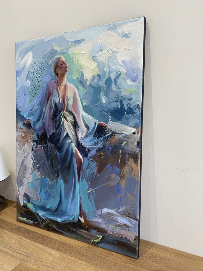 tytuł: CHWILA • Obraz malowany farbami olejnymi na płótnie bawełnianym o wymiarze 70x50cm, rok wykonania 2026r • Sygnowany na odwrocie - CHWILA, Jolanta Strzelczyk, 2026 • Zabezpieczony werniksem, który nasyca kolory oraz chroni farbę na lat. • Boki i krawędzie są pomalowane na kolor czarny co estetycznie zamyka całość obrazu • Gotowy do powieszenia – wyposażony w zamocowaną zawieszkę umożliwiający bezpieczny montaż • Obraz przed wysyłką zabezpieczony w sztywny karton oraz folię.
