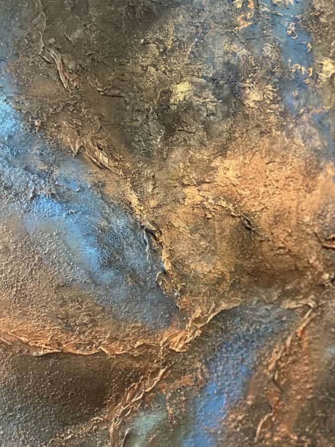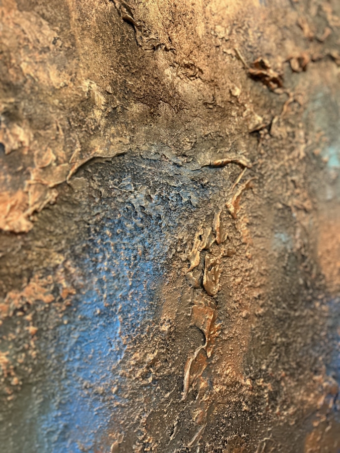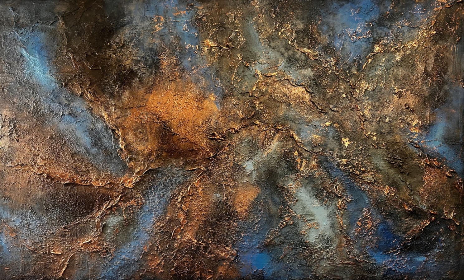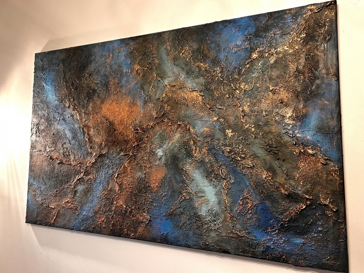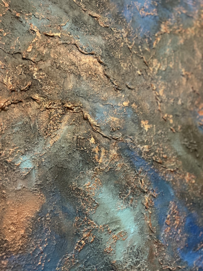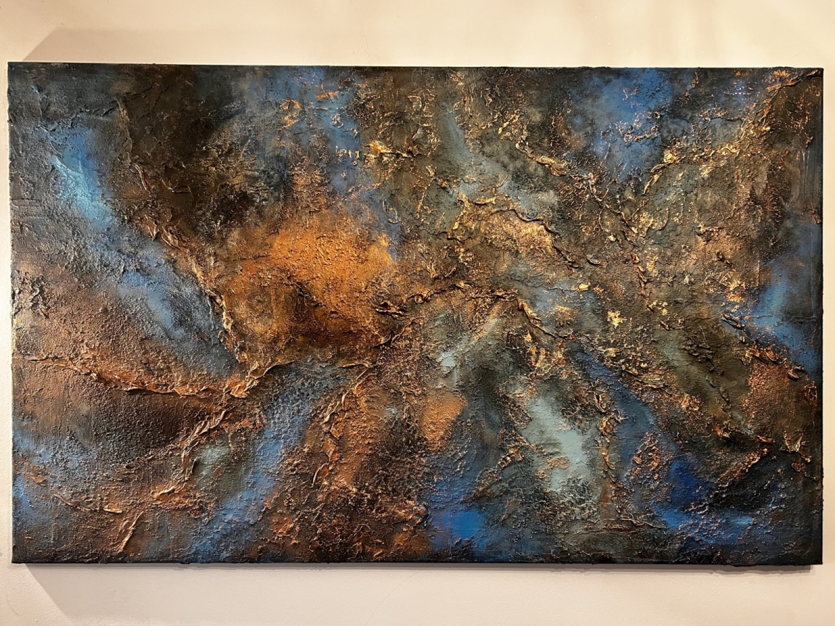 Energetyczna kompozycja o głębokiej strukturze i intensywnych kontrastach błękitu, miedzi i czerni. Obraz łączy siłę natury z ekspresją koloru – jakby lawa i skała spotkały się w jednym, pulsującym momencie. Strukturalne faktury i metaliczne refleksy nadają mu wrażenie ruchu i ciepła, przywodząc na myśl potęgę żywiołów.