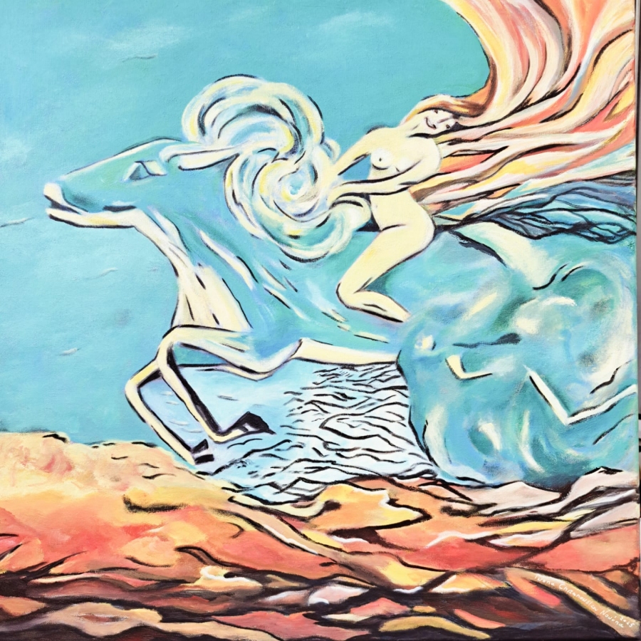Obraz nie ma nic wspólnego z "Szałem uniesień" Podkowińskiego. Inspiracją był obraz, niestety nie pamiętam nazwiska autora, wiszący w Wersalu. Nie jest to kopia, ale nawiązanie tematyczne. Lubię malować "szczęśliwe obrazy", dlatego kobieta na pędzącym koniu jest niewyobrażalnie szczęśliwa i wyzwolona. Obraz namalowany farbami akrylowymi na płótnie, ma zamalowane boki i zamontowaną zawieszkę.