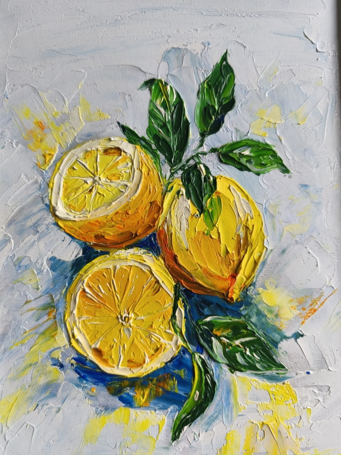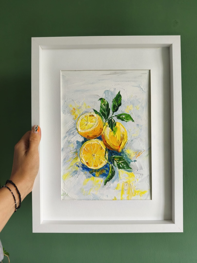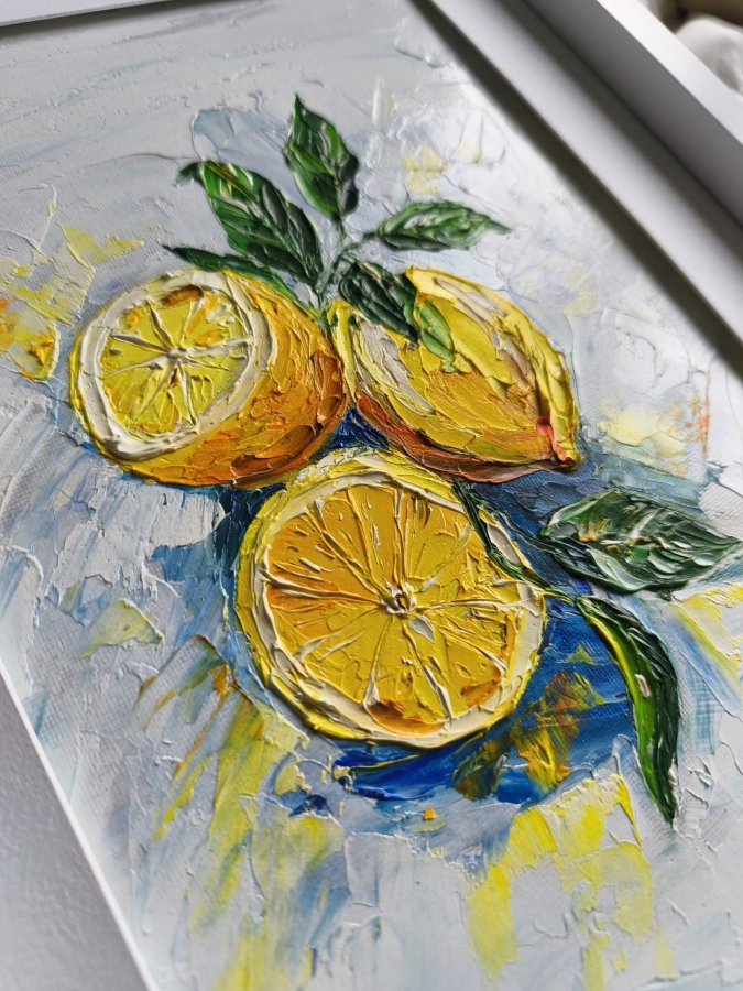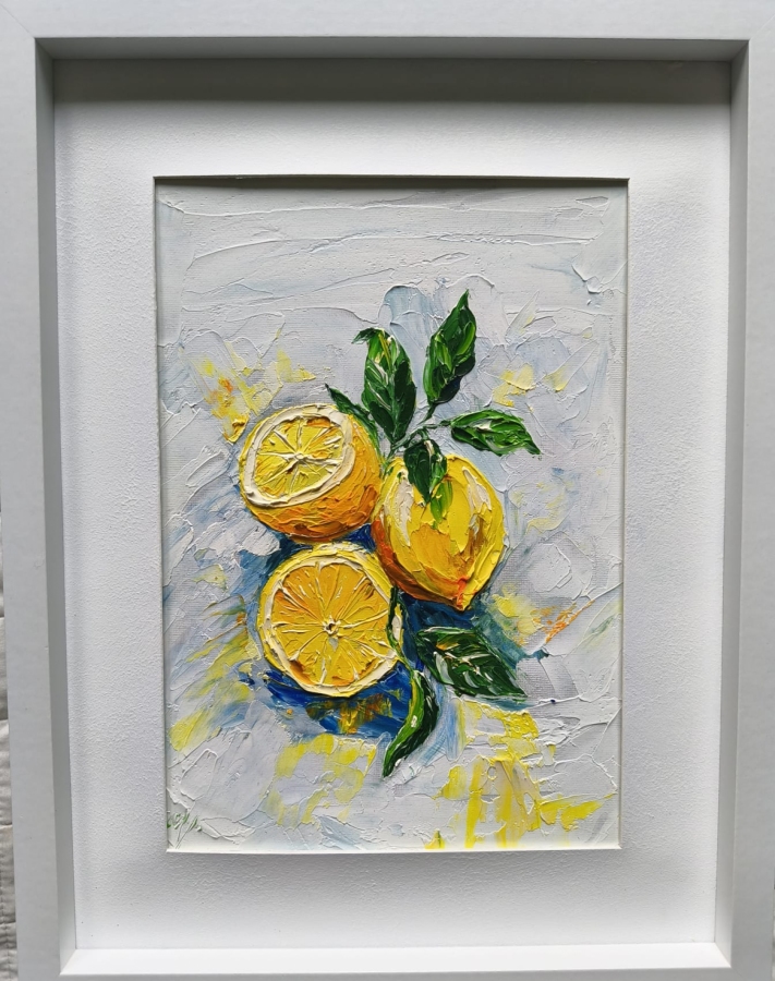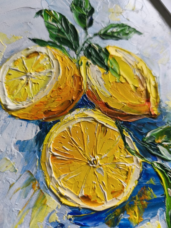 Obraz jest wielkości 24x30 ale przymocowany do ramki z passe-partout rozmiarem 30x30 cm. Obraz olejny malowany szpachlą.