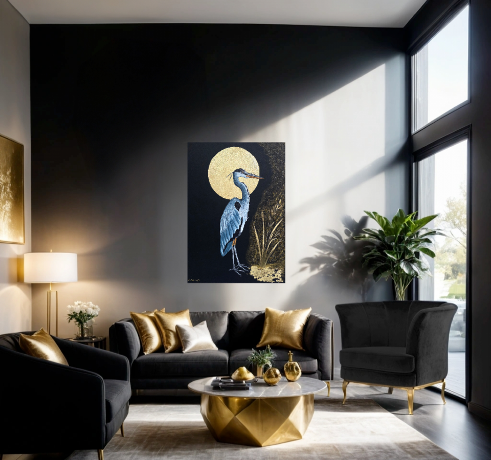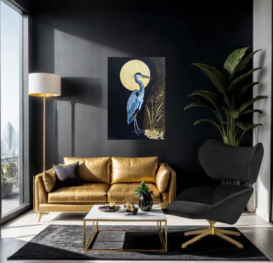 Ten wyjątkowy obraz przedstawia dostojną czaplę na tle pełni księżyca, zanurzoną w nastrojowej, niemal medytacyjnej ciszy nocnego pejzażu. Subtelna gra światła i kontrastu między głęboką czernią tła a złotą poświatą księżyca nadaje kompozycji elegancji i ponadczasowego charakteru. Delikatnie modelowane pióra ptaka oraz minimalistyczne rośliny budują wrażenie spokoju, harmonii i bliskości natury. Format: 70 × 50 cm Technika: malarstwo na płótnie Wykończenie: boki płótna są zamalowane – obraz nie wymaga ramy i jest gotowy do zawieszenia Zabezpieczenie: całość została zawerniksowana, co chroni powierzchnię i pogłębia kolory To idealna propozycja do nowoczesnych i klasycznych wnętrz – salonu, sypialni, gabinetu lub przestrzeni biurowej. Obraz przyciąga wzrok, wprowadza atmosferę spokoju i elegancji, a jednocześnie stanowi wyrazisty, artystyczny akcent. Doskonały również jako oryginalny prezent dla miłośników sztuki i natury.