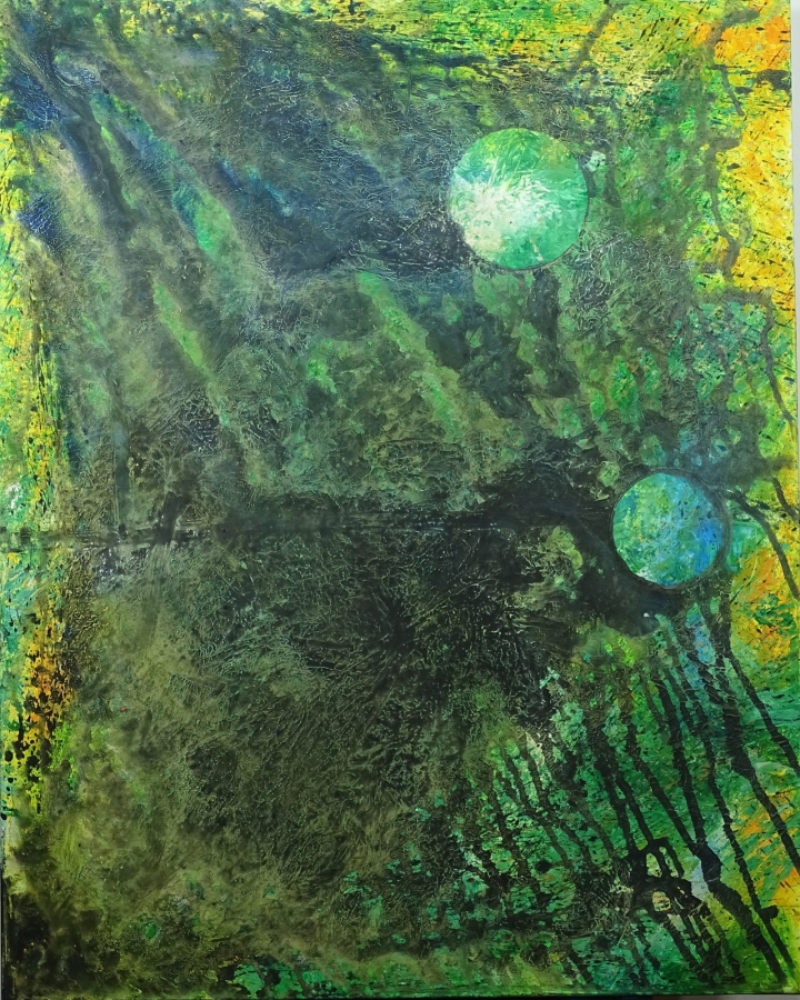 Obraz Czarna Zaraza został wykonany techniką mieszaną na płótnie bawełnianym naciągniętym na drewniany blejtram. W kompozycji artysta wykorzystał farby akrylowe oraz strukturalne medium, tworząc bogatą fakturę o niemal reliefowym charakterze. Warstwowe nałożenie barw, przetarcia i ekspresyjne linie wprowadzają wrażenie ruchu i pulsującej energii. Dominujące tony zieleni, żółci i czerni budują niepokojący, a zarazem hipnotyzujący klimat. Obraz nawiązuje do idei odrodzenia i destrukcji — kontrastu między naturą a rozkładem, światłem a cieniem. Dwie sferyczne formy w kompozycji przywodzą na myśl planety lub mikroskopijne organizmy, co nadaje dziełu charakter organiczno-kosmicznej metafory. Czarna Zaraza doskonale zaprezentuje się w nowoczesnych przestrzeniach, loftach lub wnętrzach o minimalistycznym wystroju. To wyraziste rękodzieło artystyczne — dzieło pełne symboliki i emocji, idealne dla kolekcjonerów ceniących abstrakcję i ekspresję.