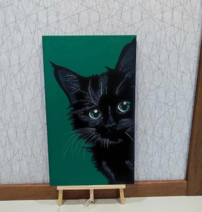 Mam do sprzedania obraz kotka. Malowany własnoręcznie farbami akrylowymi na płótnie bawełnianym. Wymiary 50x30 cm Boki zamalowane w kolorze tła. Inspirowany Werniksowany