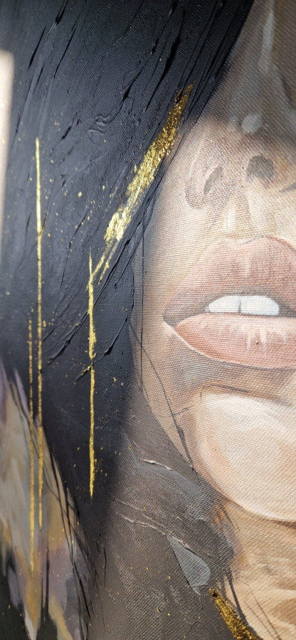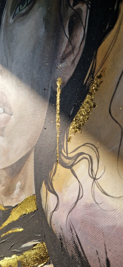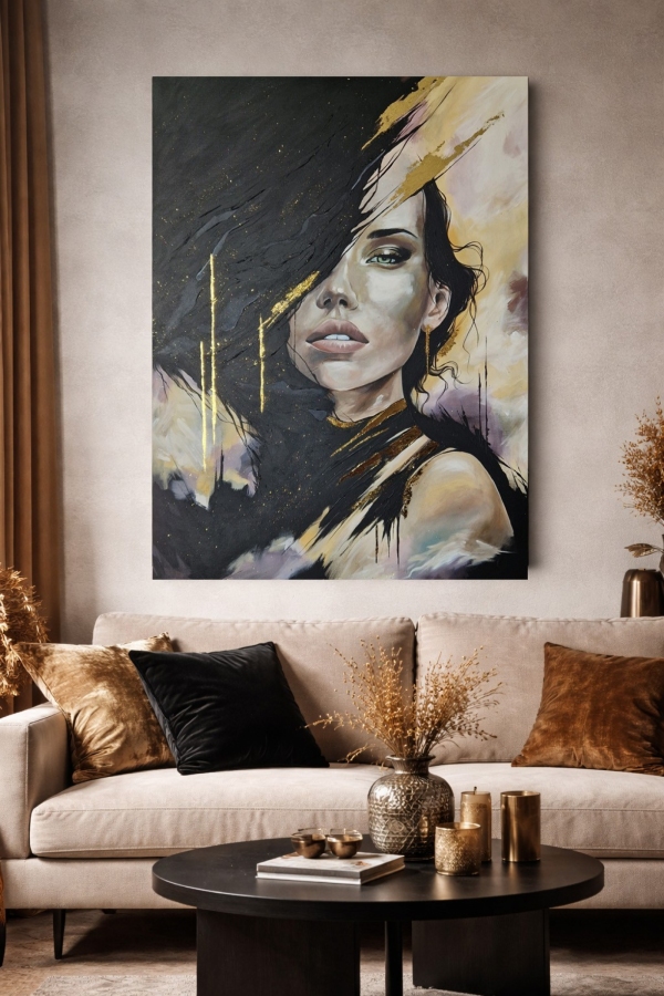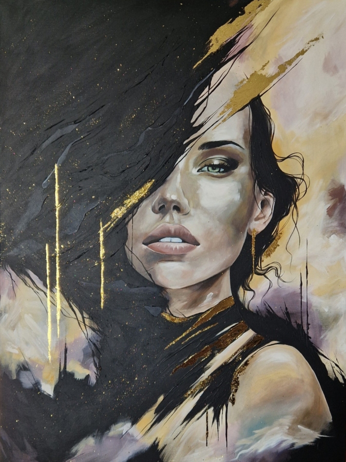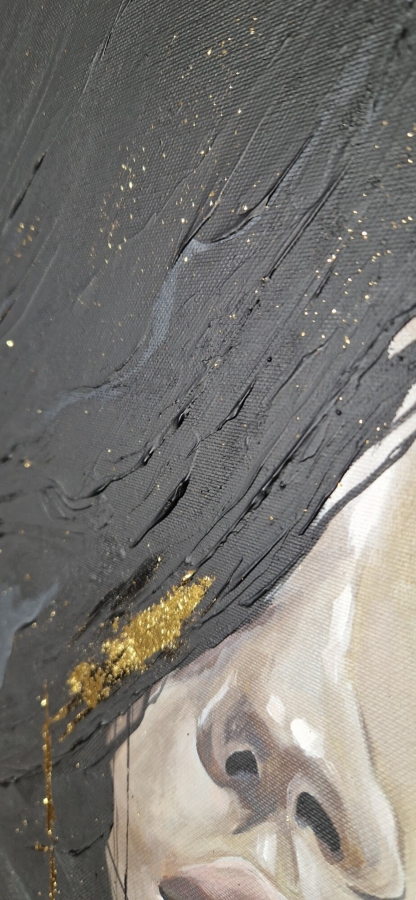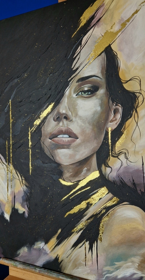 Kobiecy portret, obraz do nowoczesnego wnętrza. Ręcznie malowany obraz na płótnie bawełnianym wykonany wysokiej klasy farbami. Sygnowany nazwiskiem autorki I. Smorońska i datą, potwierdzającym autentyczności obrazu. Obraz w formacie: 80x60 cm. Z pozłoceniami wykonanymi szlagmetalem. Widoczna jest struktura farby. Odwzorowanie kolorów na obrazie może nieznacznie różnić się od oryginału, ponieważ spowodowane jest to techniką fotografii lub ustawieniem Państwa monitorów.