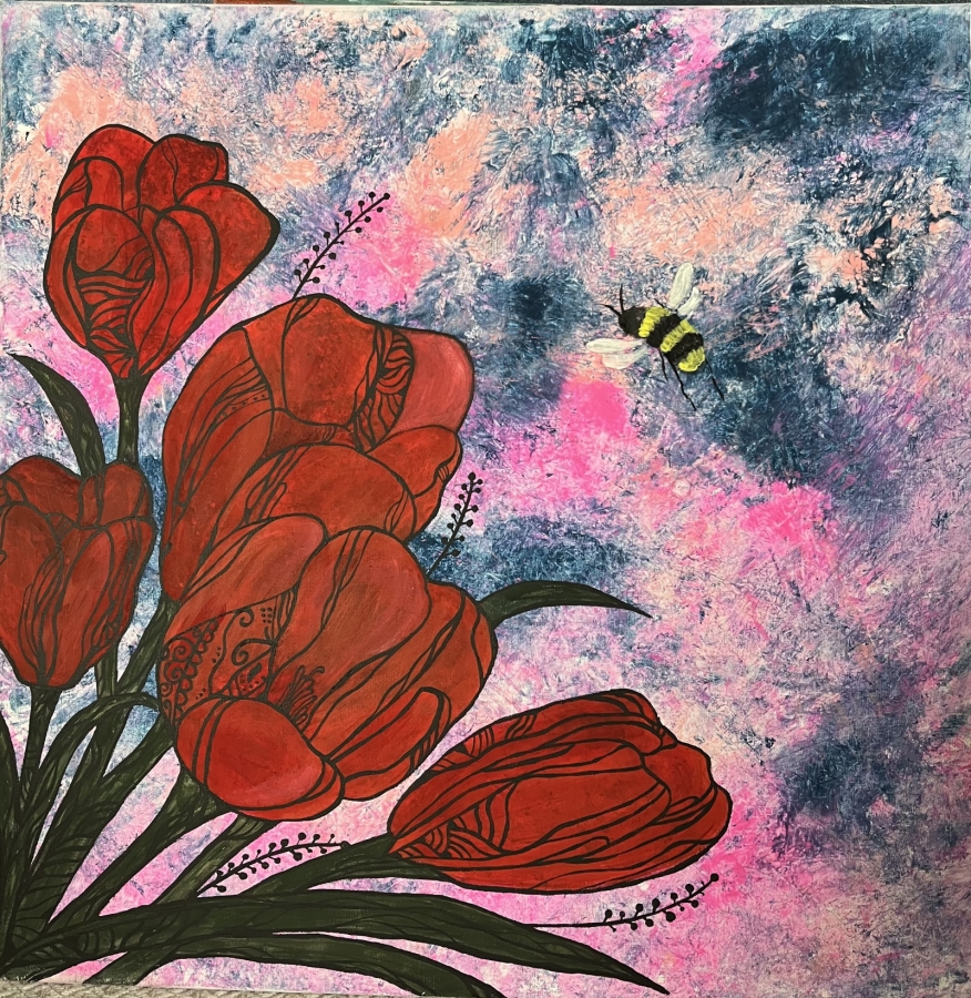 Czerwień, która nie przeprasza za swoją intensywność ???? Ten obraz to opowieść o energii, kobiecej sile i odwadze bycia widoczną. Tulipany – mocne, wyraziste, niemal pulsujące na tle ekspresyjnego, różowo-granatowego nieba.