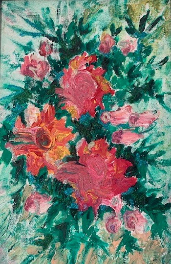 „Czerwone i różowe kwiaty” to żywy obraz przedstawiający bogaty bukiet czerwonych i różowych kwiatów otoczonych ciemnozielonymi liśćmi. Kwiaty namalowane są wyrazistymi, ekspresyjnymi pociągnięciami pędzla, które nadają im fakturę i ruch. Odcienie czerwieni, koralu i delikatnego różu mieszają się ze sobą, tworząc dynamiczną i żywą kompozycję. Zielone tło jest wielowarstwowe, z różnymi odcieniami, które dodają głębi i kontrastu jasnym płatkom. Kompozycja wypełnia większość płótna, sprawiając, że kwiaty wydają się bujne i pełne życia. Silny kontrast między ciepłymi barwami kwiatów a chłodnymi tonami zieleni wzmacnia efekt wizualny. Obraz przywołuje namiętność, energię i naturalne piękno.