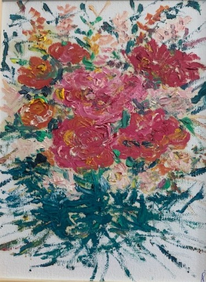 „Czerwone kwiaty” to żywy i pełen emocji obraz przedstawiający gęsty bukiet w pełnym rozkwicie. Dominującymi kolorami są intensywne odcienie czerwieni i karmazynu, uzupełnione akcentami pomarańczy, różu i głębokiej zieleni liści. Kwiaty zajmują centralną przestrzeń, rozchodząc się na zewnątrz energicznymi, teksturowanymi pociągnięciami pędzla, które tworzą wrażenie ruchu. Tło jest jasne i stonowane, co pozwala wyrazistym kwiatom na wyeksponowanie się. Tematem przewodnim jest witalność, namiętność i surowe piękno natury. Całość tworzy silne i ekspresyjne wrażenie, uchwycając zarówno ciepło, jak i dynamiczną energię poprzez impresjonistyczny styl.