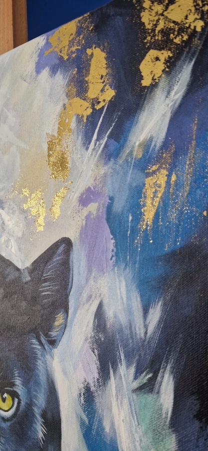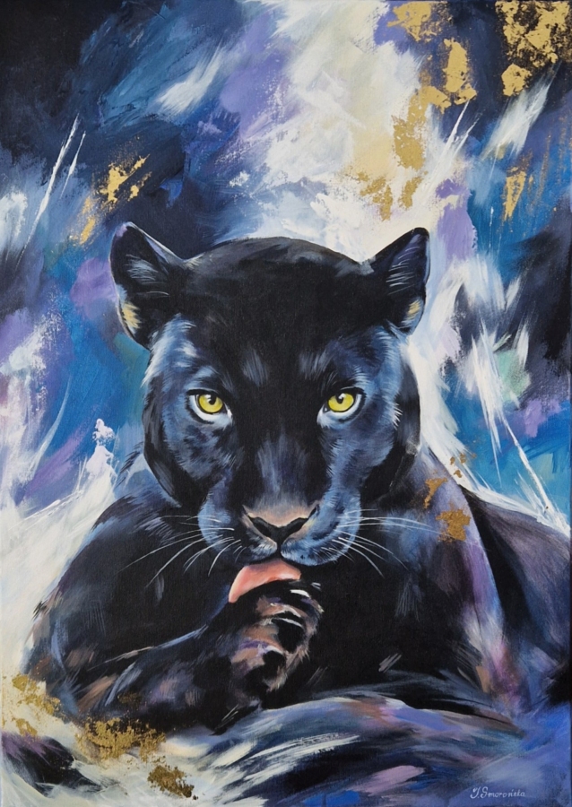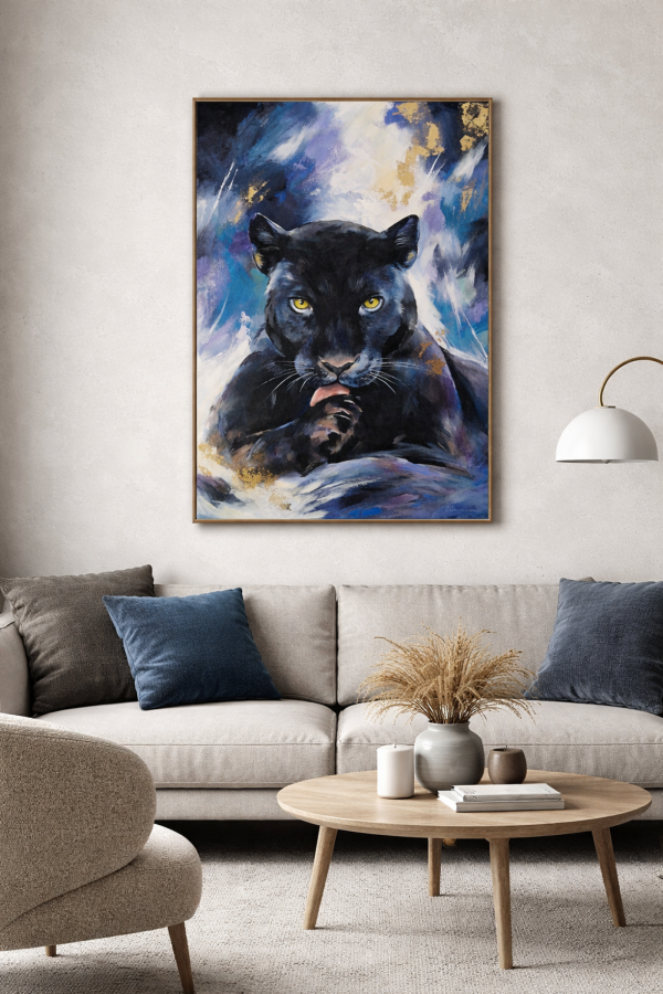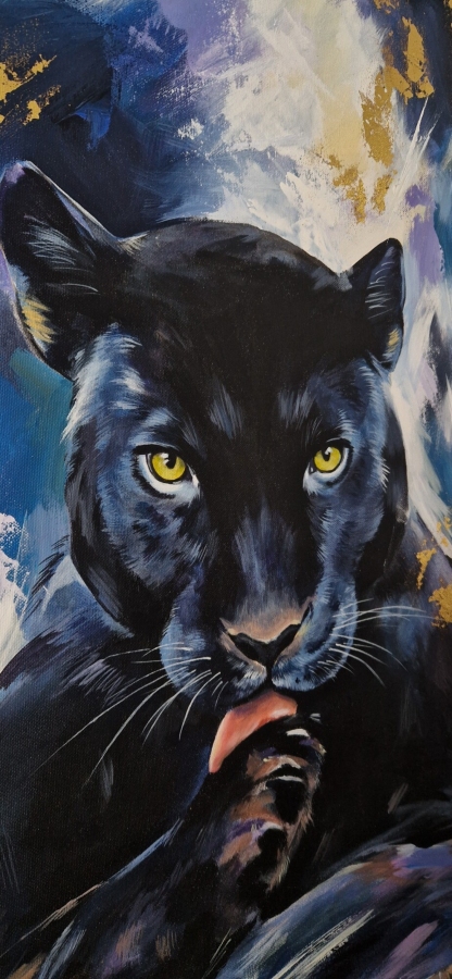 Obraz przedstawia czarną panterę uchwyconą w chwili skupienia i czujnej ciszy. Intensywne, żółte spojrzenie kontrastuje z głęboką czernią futra, budując napięcie między spokojem a ukrytą siłą. Motyw zwierzęcia staje się tu symbolem niezależności, instynktu i wewnętrznej mocy. Malarskie tło, utrzymane w chłodnej palecie błękitów, fioletów i szarości, nadaje kompozycji nowoczesny, ekspresyjny charakter, jednocześnie podkreślając realizm głównego motywu. Widoczne pociągnięcia pędzla i praca warstwowa budują głębię oraz dynamikę obrazu, nie odbierając mu elegancji. Praca doskonale odnajdzie się w nowoczesnych wnętrzach — zarówno minimalistycznych, jak i bardziej eklektycznych — stanowiąc wyrazisty, ale wyważony akcent wizualny. Obraz jest oryginałem, sygnowanym przez artystkę.