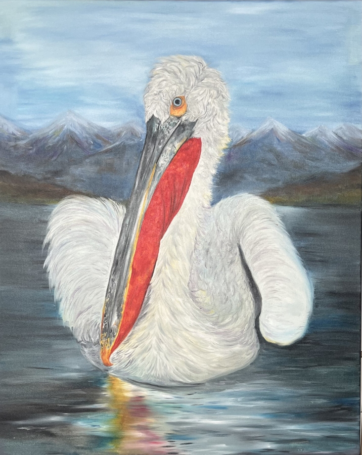 Obraz olejny na płótnie – „Kędzierzawy Pelikan” (100 × 80 cm) Ręcznie malowany obraz olejny na płótnie, przedstawiający kędzierzawego pelikana. Format: 100 × 80 cm. Obraz wyróżnia się wyrazistymi kolorami i detalami, idealny do salonu lub biura.