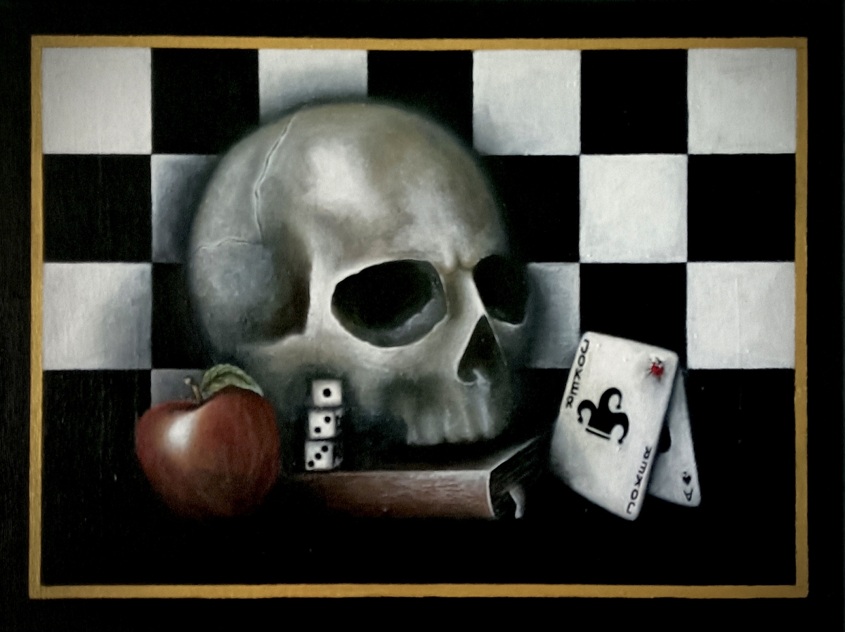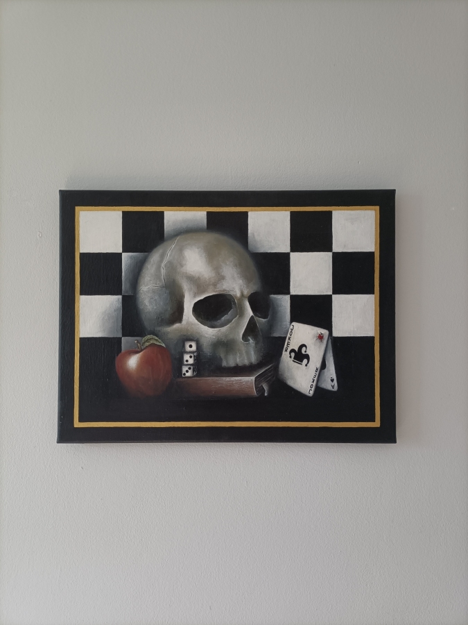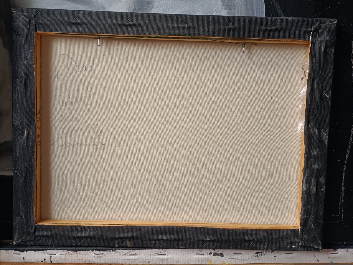 "Dead" to obraz o grze życia. Klasyczna symbolika nadaje pracy głębszy sens. Tło szachowe spaja inne gry które prowadzą zawsze do jednego. Dziś wygrywasz, jutro może przegrasz.