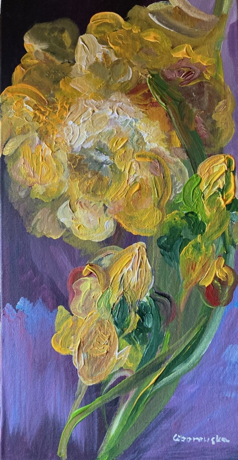 Obraz namalowany jest techniką impastu. Leciutko opadający irys to efekt upalnego dnia. Nadałam mu bardzo osobisty wyraz. Barwa nocy wraz z kolorem kwiatu pomogły mi pokazać jego delikatność i subtelność. Światło irysa to „siła” obrazu. Namalowany jest farbami akrylowymi na płótnie naklejonym na płytę.