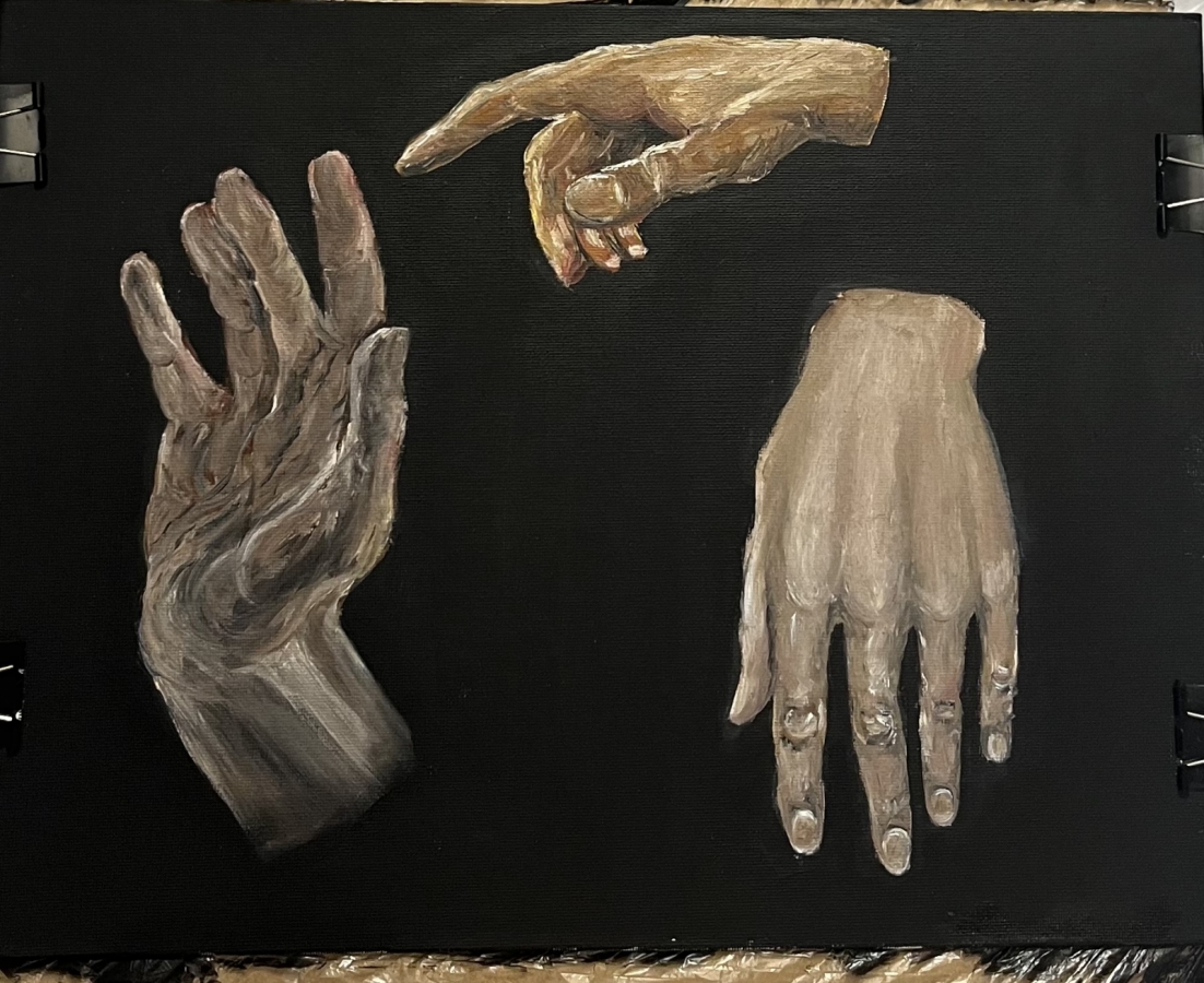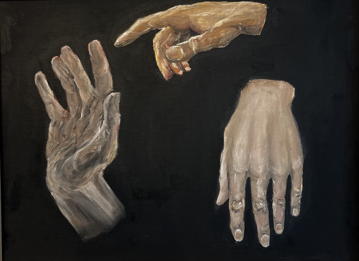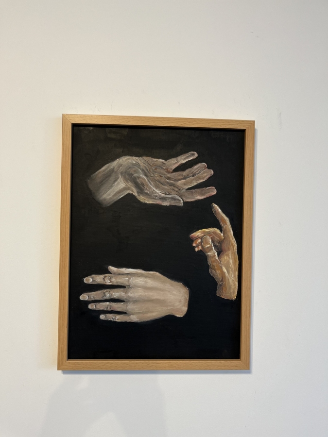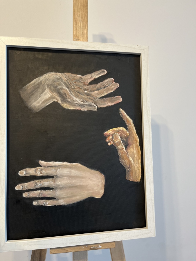 Symboliczna kompozycja trzech dłoni na czarnym tle – o emocjonalnej, niemal mistycznej aurze. Malowany olejem na płycie.Rama