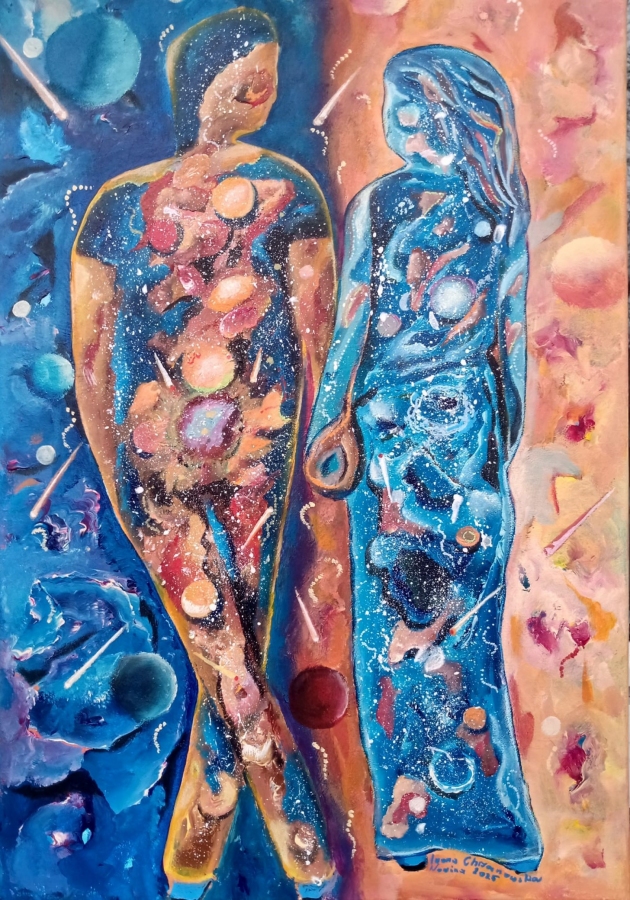 Obraz nieoczywisty, nieco surrealistyczny nawiązuje do odmienności ludzi, każdy jest mikrokosmosem, co nie przeszkadza wzajemnie się uzupełniać i tworzyć wspaniałe relacje. Przeciwności się przyciągają. Namalowany farbami akrylowymi na płótnie, boki są zamalowane, zamontowana zawieszka.