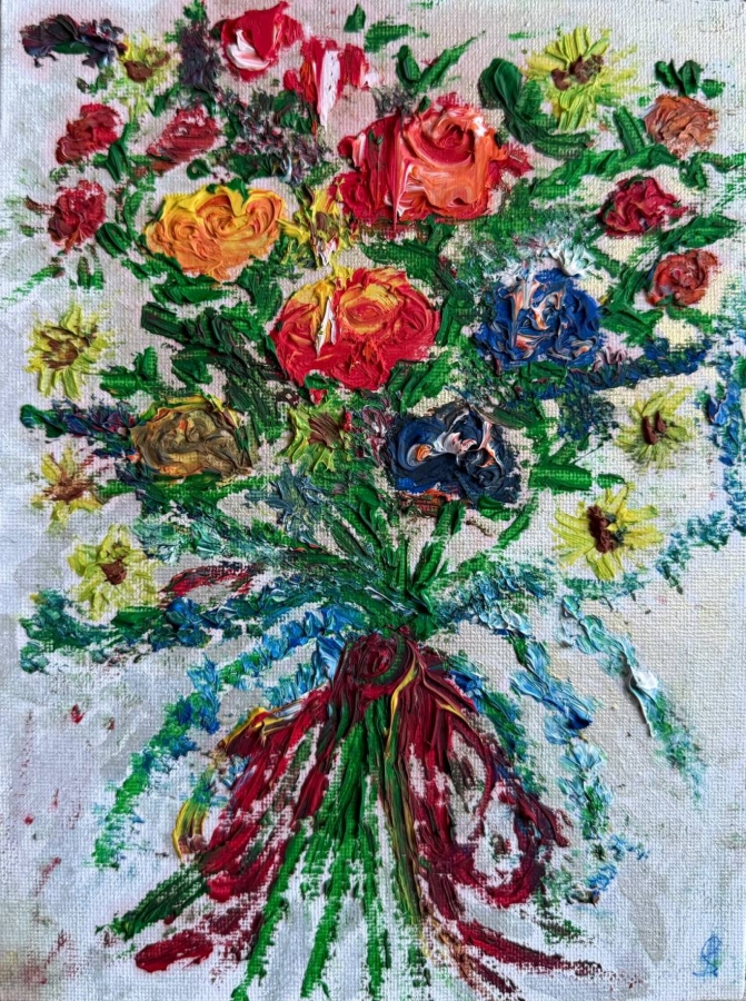 Kwiaty emanujące życiem , dynamiką .„Dynamiczne kwiaty” to ekspresyjny obraz, który ukazuje żywy bukiet ułożony w luźną, energiczną kompozycję. Każdy może podziwiać bogactwo kwiatów, w tym wyraziste odcienie czerwieni, pomarańczy, różu i głębokiego błękitu, otoczone soczystą zielenią liści. Intensywne i wielowarstwowe kolory tworzą wrażenie ruchu i emocjonalnej intensywności. Grube, widoczne pociągnięcia pędzla nadają kwiatom fakturę i sprawiają, że bukiet wydaje się niemal żywy. Jasne i delikatnie płynne tło podkreśla jasność kompozycji kwiatowej. Czerwona wstążka spina łodygi, dodając mocny akcent u dołu kompozycji. Ogólny styl jest impresjonistyczny, i kładzie nacisk na światło, kolor i dynamikę, ale też na precyzję detali.