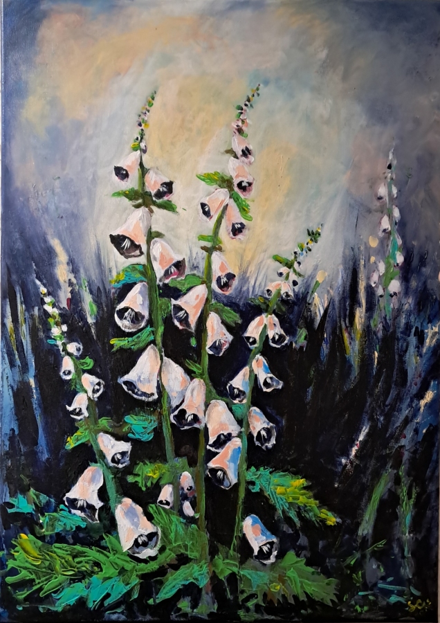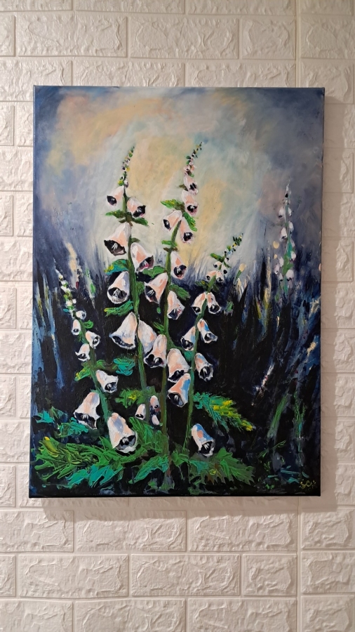 Dzwonki w trawach , kolorystyka ciemna, przewaga fioletu.Kontrastowe kwiaty wprowadzają widza w tajemniczy nastrój.Obraz pełen eksresji wywołany przez poruszające się na wietrze dzwonki.Liście wykonane szpachlą , widać fakturę ktora współgra z spokojnym ,gładkim tłem.