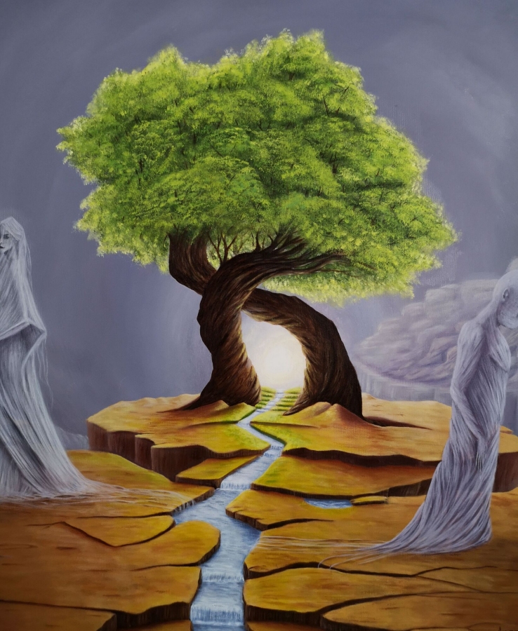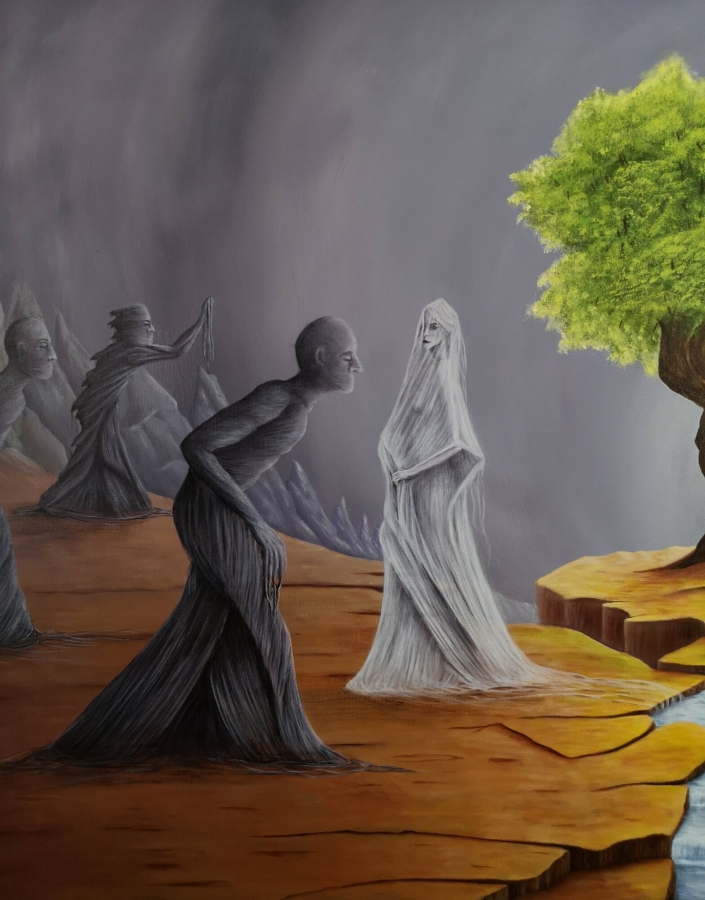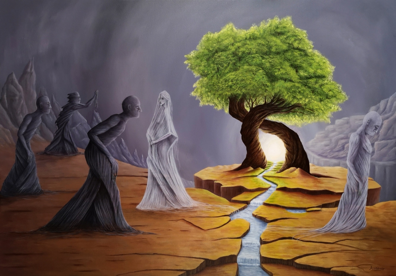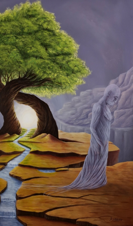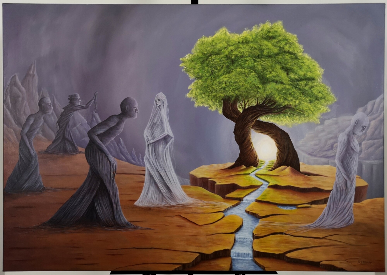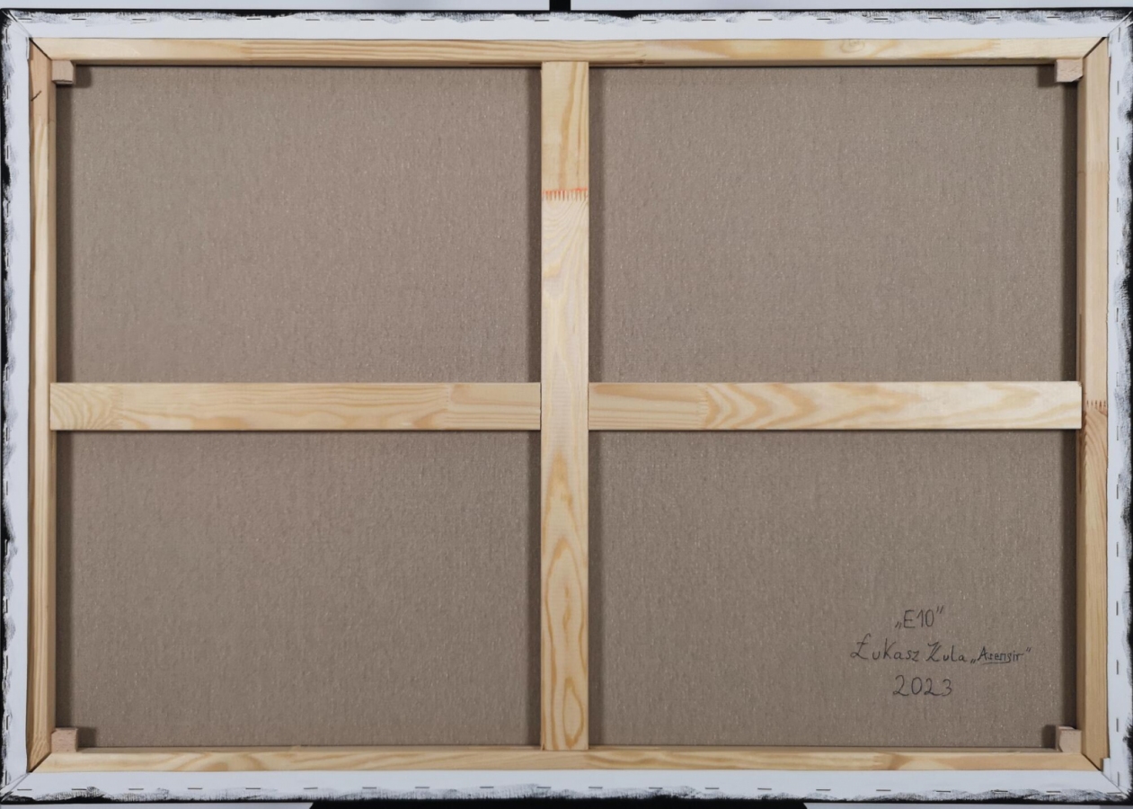 Obraz akrylowy na płótnie bawełnianym, malarstwo surrealistyczne. Praca sygnowana: z przodu - podpis artysty „Asensir”, z tyłu – tytuł / podpis, imię i nazwisko artysty / rok powstania. Praca nie zawiera ramy, boczne krawędzie płótna zamalowane estetycznie na czarno - obraz gotowy do powieszenia. Wymiary: 70x100x2cm. Obrazy artysty są spojrzeniem do świata snów. Cykl „E” to osobista seria prac, w której artysta konfrontuje się z własnymi emocjami, kruchością i doświadczeniami. Rozpadające się postaci, zatrzymane w jednej, melancholijnej chwili, pokazują balans pomiędzy mocą a słabością, brutalnością a spokojem. To szczera refleksja o tym, jak to jest być człowiekiem - o naszych pęknięciach, o miejscach, w których się gubimy, i o próbie zrozumienia siebie w chaosie uczuć. Pomimo mocnego ładunku emocjonalnego, prace utrzymane są w barwach, które działają jak subtelny filtr - pokazują, że nawet w najtrudniejszym doświadczeniu można dostrzec refleksję czy szansę na pogodzenie się z samym sobą. Prace artysty znajdują się w prywatnych kolekcjach w Polsce oraz m.in. w USA, Japonii, RPA, Niemczech, Hiszpanii, Francji, Izraelu.
