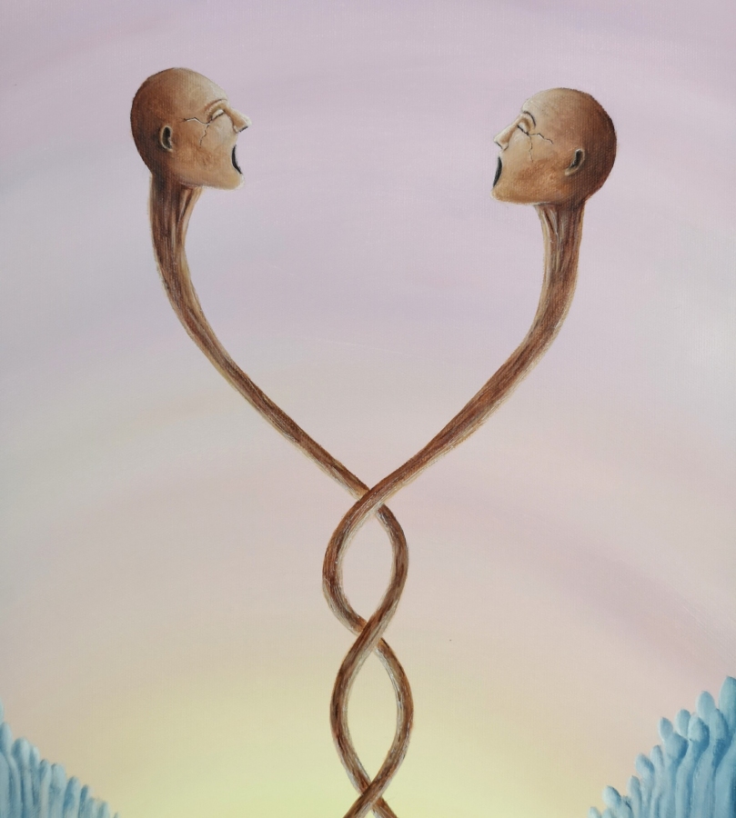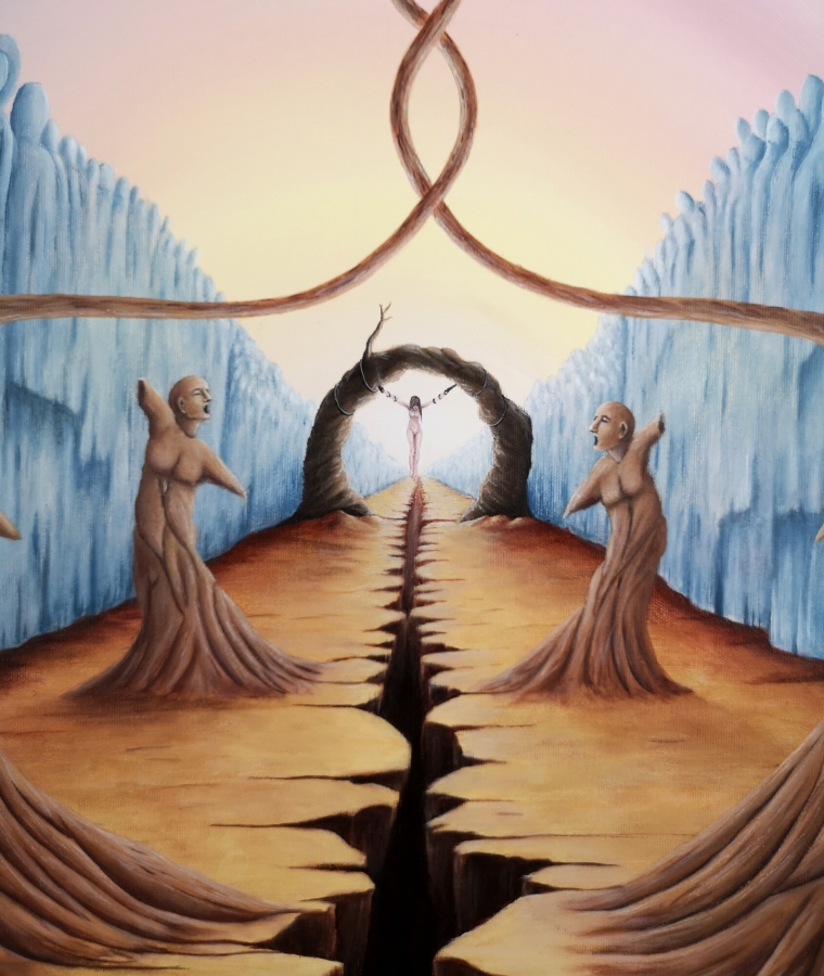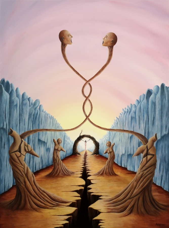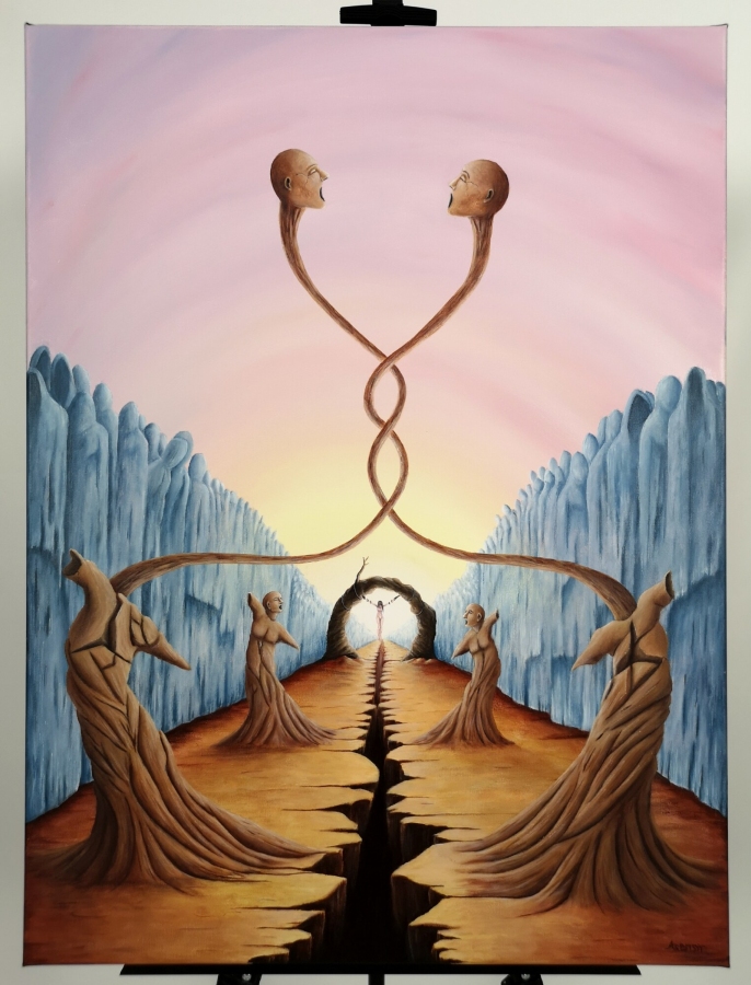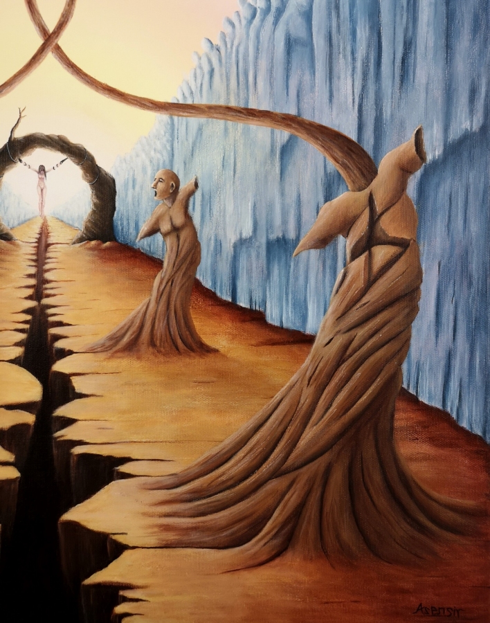 Obraz akrylowy na płótnie bawełnianym, malarstwo surrealistyczne. Praca sygnowana: z przodu - podpis artysty „Asensir”, z tyłu – tytuł / podpis, imię i nazwisko artysty / rok powstania. Praca nie zawiera ramy, boczne krawędzie płótna zamalowane estetycznie na czarno - obraz gotowy do powieszenia. Wymiary: 80x60x2cm. Obrazy artysty są spojrzeniem do świata snów. Cykl „E” to osobista seria prac, w której artysta konfrontuje się z własnymi emocjami, kruchością i doświadczeniami. Rozpadające się postaci, zatrzymane w jednej, melancholijnej chwili, pokazują balans pomiędzy mocą a słabością, brutalnością a spokojem. To szczera refleksja o tym, jak to jest być człowiekiem - o naszych pęknięciach, o miejscach, w których się gubimy, i o próbie zrozumienia siebie w chaosie uczuć. Pomimo mocnego ładunku emocjonalnego, prace utrzymane są w barwach, które działają jak subtelny filtr - pokazują, że nawet w najtrudniejszym doświadczeniu można dostrzec refleksję czy szansę na pogodzenie się z samym sobą. Prace artysty znajdują się w prywatnych kolekcjach w Polsce oraz m.in. w USA, Japonii, RPA, Niemczech, Hiszpanii, Francji, Izraelu.