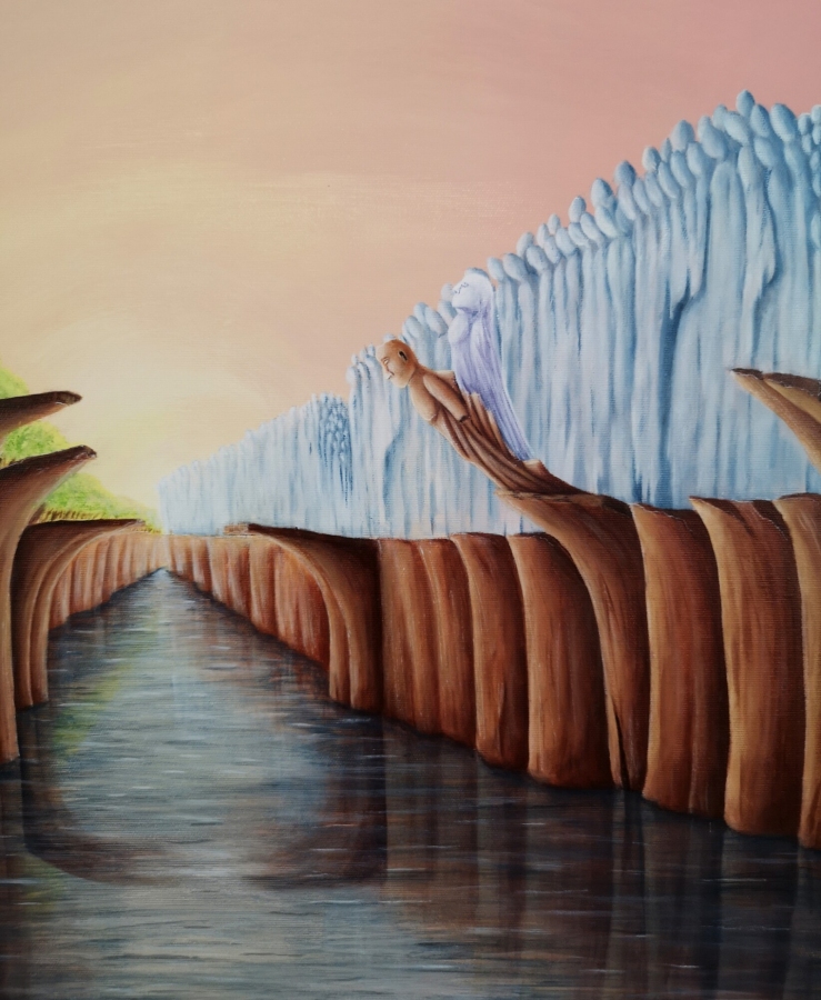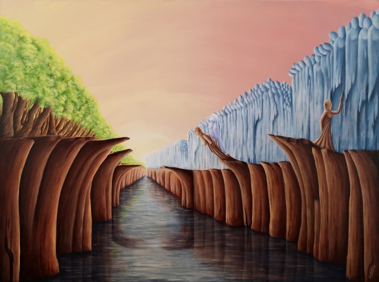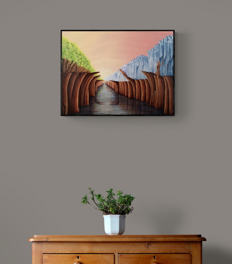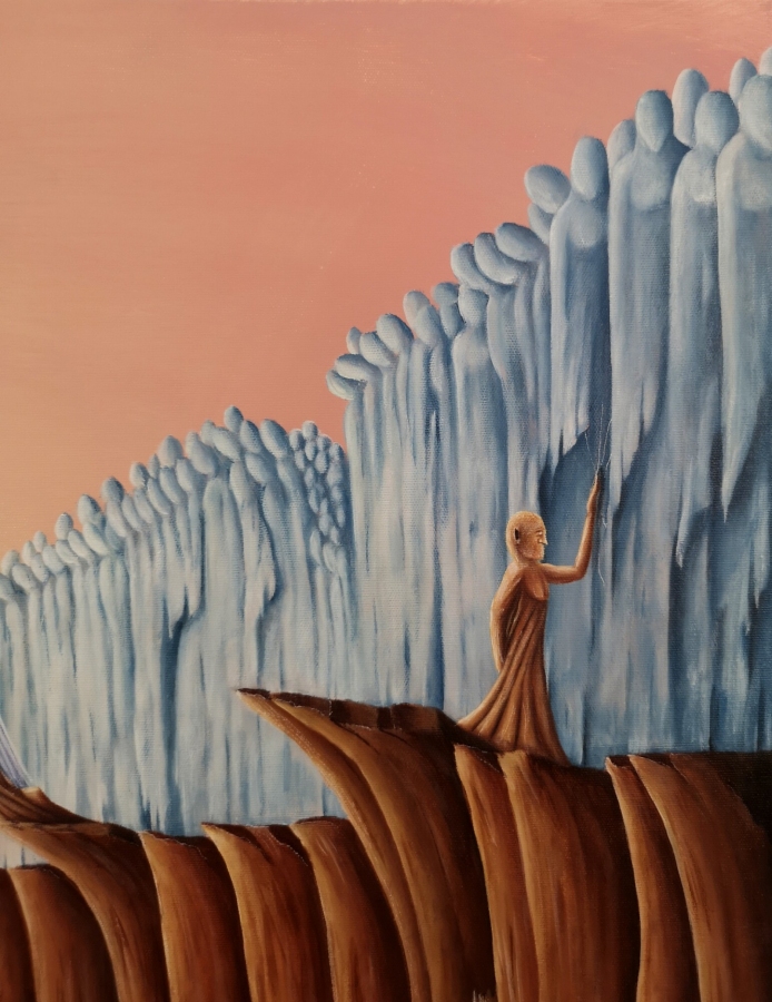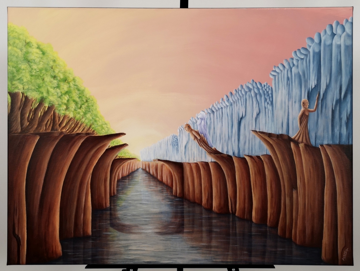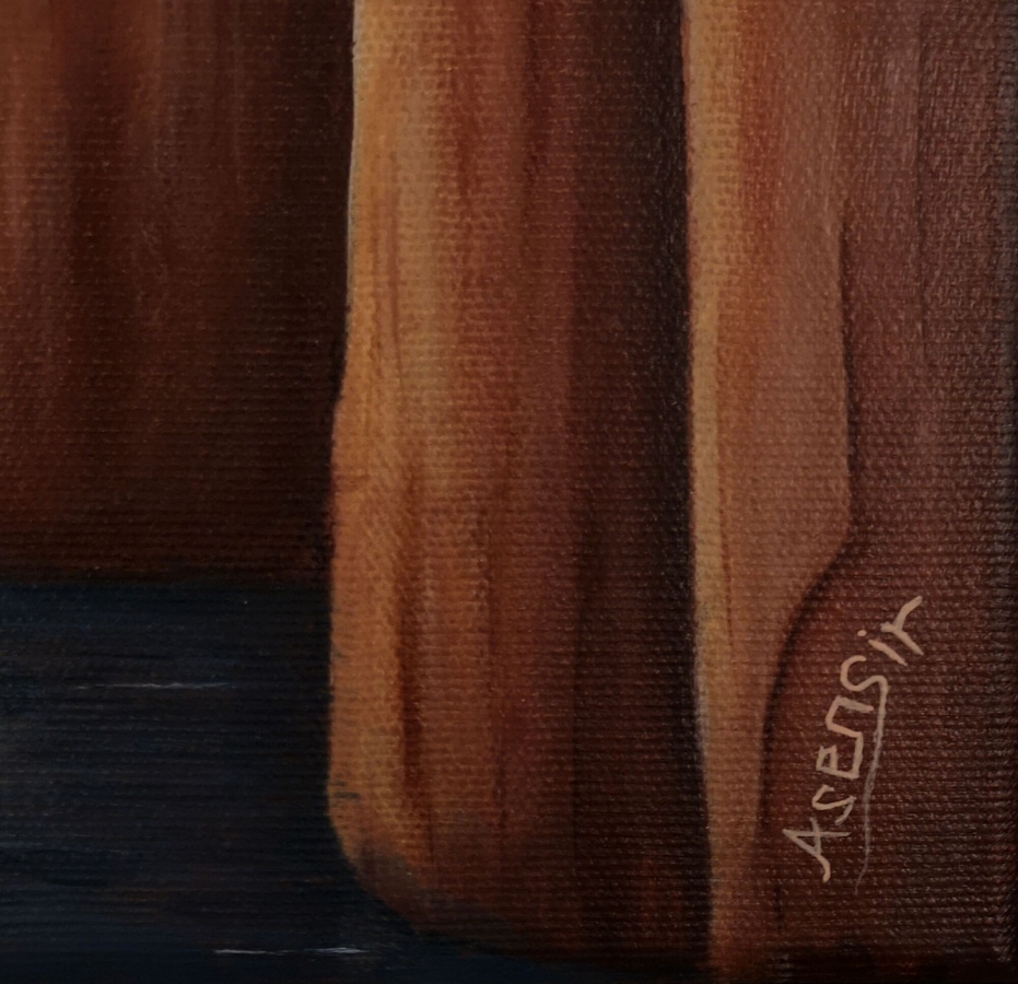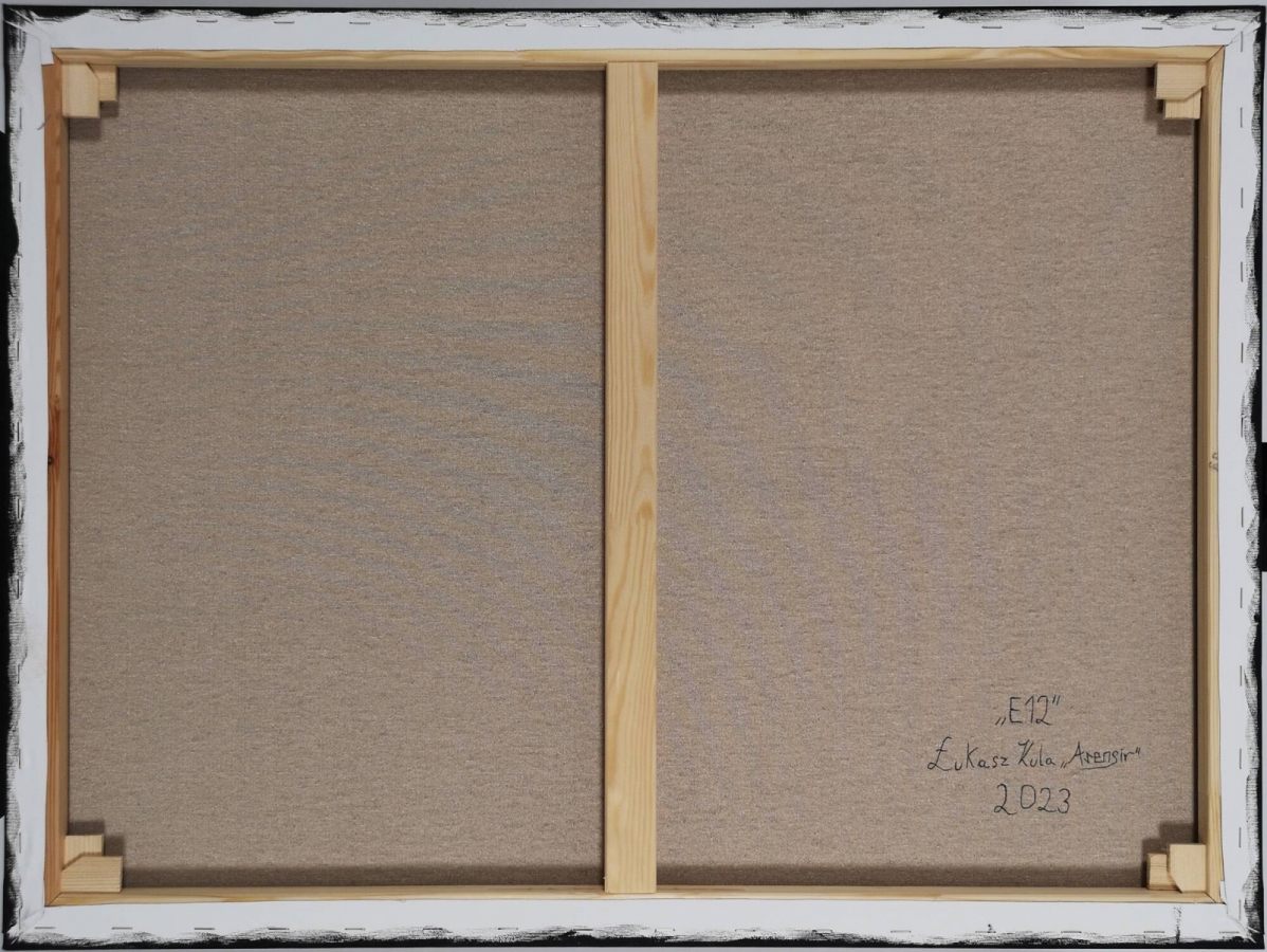 Obraz akrylowy na płótnie bawełnianym, malarstwo surrealistyczne. Praca sygnowana: z przodu - podpis artysty „Asensir”, z tyłu – tytuł / podpis, imię i nazwisko artysty / rok powstania. Praca nie zawiera ramy, boczne krawędzie płótna zamalowane estetycznie na czarno - obraz gotowy do powieszenia. Wymiary: 60x80x2cm. Obrazy artysty są spojrzeniem do świata snów. Cykl „E” to osobista seria prac, w której artysta konfrontuje się z własnymi emocjami, kruchością i doświadczeniami. Rozpadające się postaci, zatrzymane w jednej, melancholijnej chwili, pokazują balans pomiędzy mocą a słabością, brutalnością a spokojem. To szczera refleksja o tym, jak to jest być człowiekiem - o naszych pęknięciach, o miejscach, w których się gubimy, i o próbie zrozumienia siebie w chaosie uczuć. Pomimo mocnego ładunku emocjonalnego, prace utrzymane są w barwach, które działają jak subtelny filtr - pokazują, że nawet w najtrudniejszym doświadczeniu można dostrzec refleksję czy szansę na pogodzenie się z samym sobą. Prace artysty znajdują się w prywatnych kolekcjach w Polsce oraz m.in. w USA, Japonii, RPA, Niemczech, Hiszpanii, Francji, Izraelu.