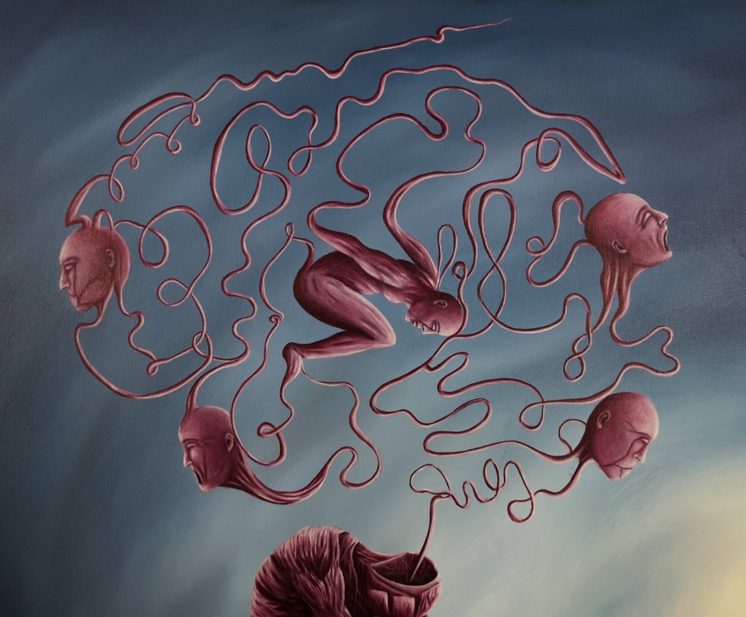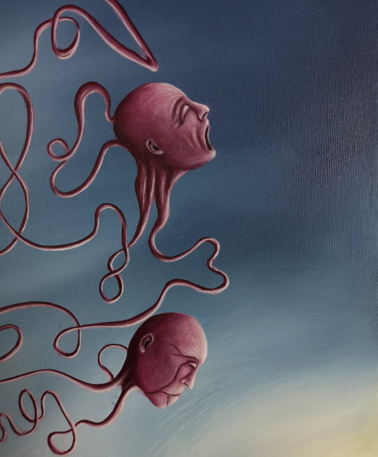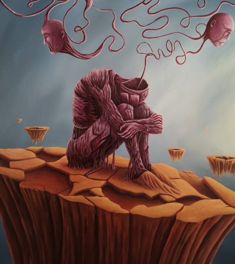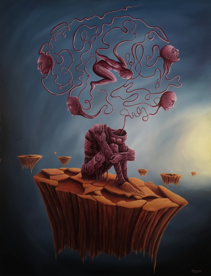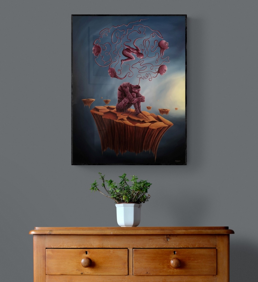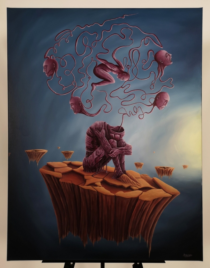 Obraz akrylowy na płótnie bawełnianym, malarstwo surrealistyczne. Praca sygnowana: z przodu - podpis artysty „Asensir”, z tyłu – tytuł / podpis, imię i nazwisko artysty / rok powstania. Praca nie zawiera ramy, boczne krawędzie płótna zamalowane estetycznie na czarno - obraz gotowy do powieszenia. Wymiary: 90x70x2cm. Obrazy artysty są spojrzeniem do świata snów. Cykl „E” to osobista seria prac, w której artysta konfrontuje się z własnymi emocjami, kruchością i doświadczeniami. Rozpadające się postaci, zatrzymane w jednej, melancholijnej chwili, pokazują balans pomiędzy mocą a słabością, brutalnością a spokojem. To szczera refleksja o tym, jak to jest być człowiekiem - o naszych pęknięciach, o miejscach, w których się gubimy, i o próbie zrozumienia siebie w chaosie uczuć. Pomimo mocnego ładunku emocjonalnego, prace utrzymane są w barwach, które działają jak subtelny filtr - pokazują, że nawet w najtrudniejszym doświadczeniu można dostrzec refleksję czy szansę na pogodzenie się z samym sobą. Prace artysty znajdują się w prywatnych kolekcjach w Polsce oraz m.in. w USA, Japonii, RPA, Niemczech, Hiszpanii, Francji, Izraelu.